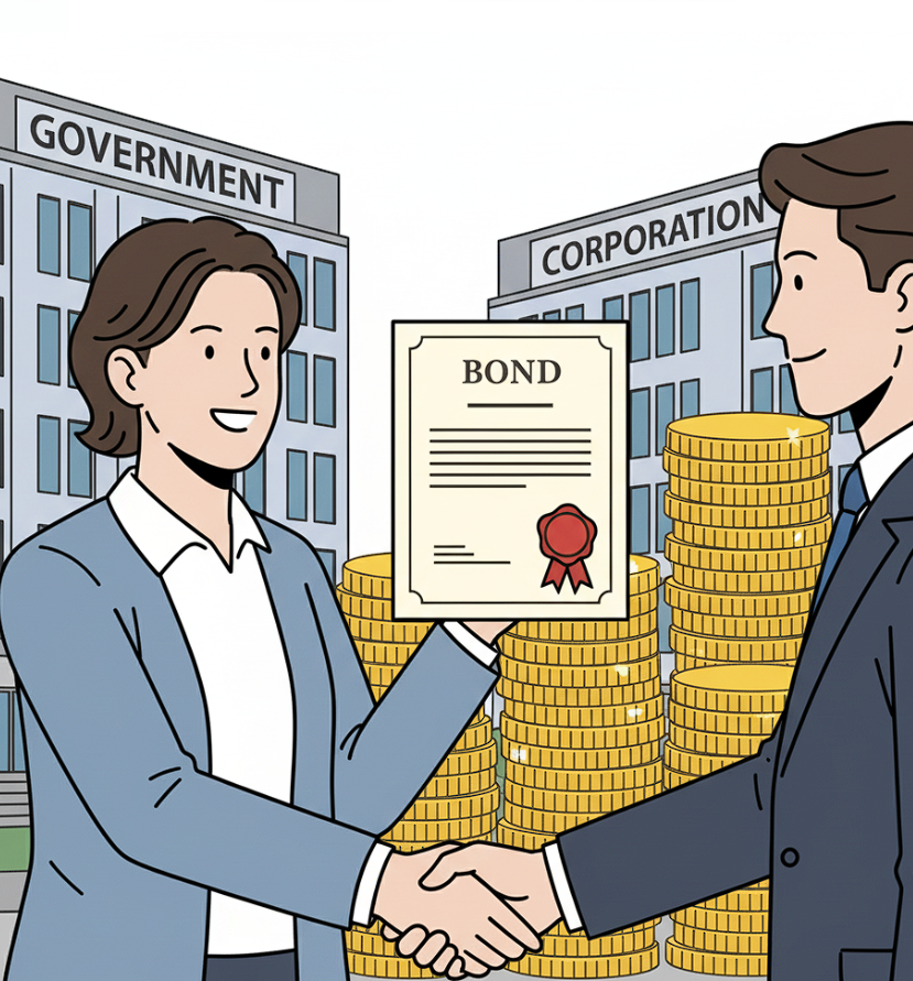 • 채권(Bond)이란?: 기업이나 정부가 돈이 필요할 때 발행하는 '차용증' 같은 거예요. '비티컴퍼니'가 이번에는 1억 원을 빌리기 위해 채권을 발행하고, '5년 뒤에 이자 포함해서 1억 1천만 원을 갚겠다'고 약속하는 거죠.