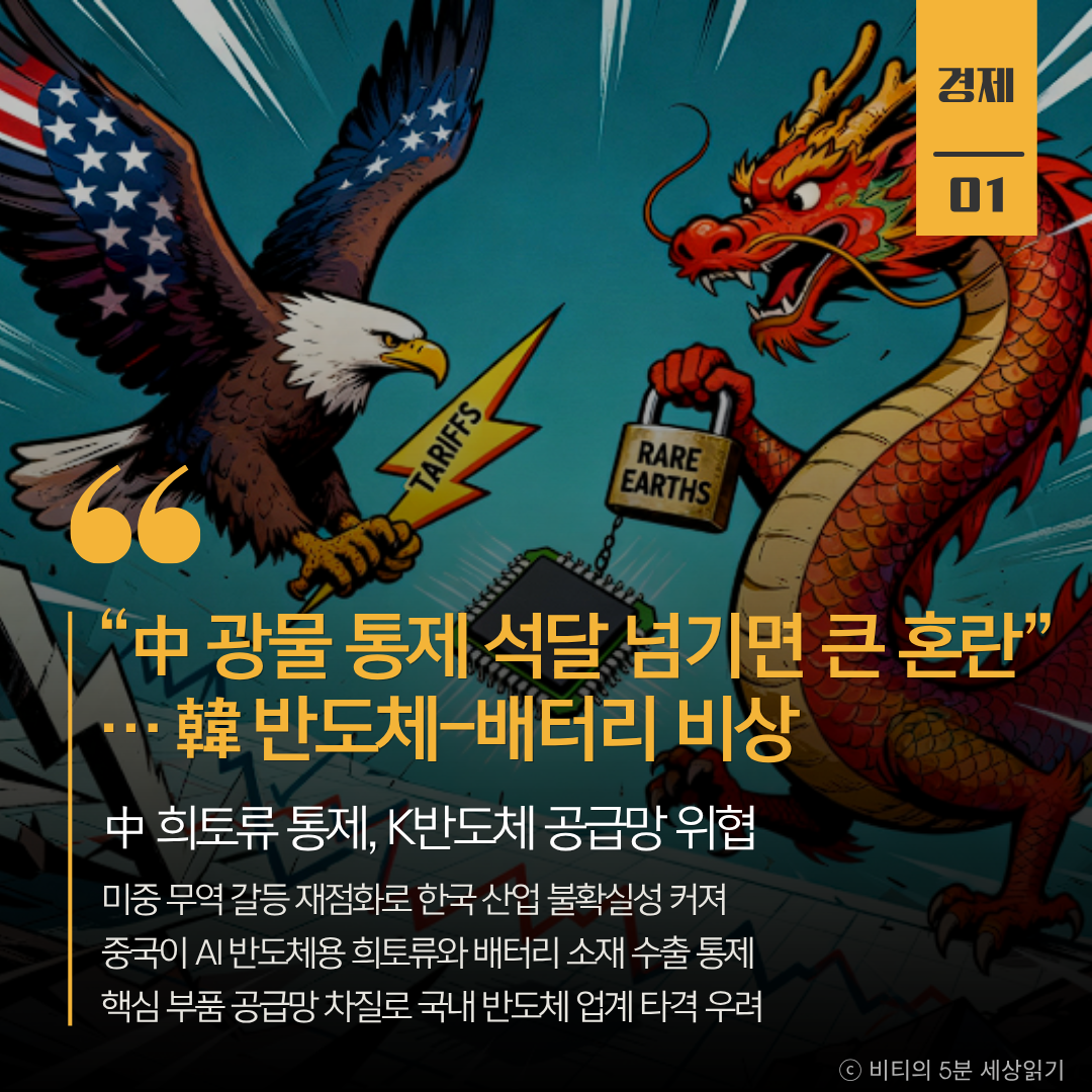 미중 통상 갈등이 재점화되면서 중국은 AI 반도체용 희토류와 배터리 소재 수출을 통제하고, 미국은 100% 관세로 맞불을 놓았다. 이로 인해 ASML 등 핵심 장비 수급에 차질이 예상되는 등 한국의 반도체와 배터리 공급망에 큰 불확실성이 생겼다.
