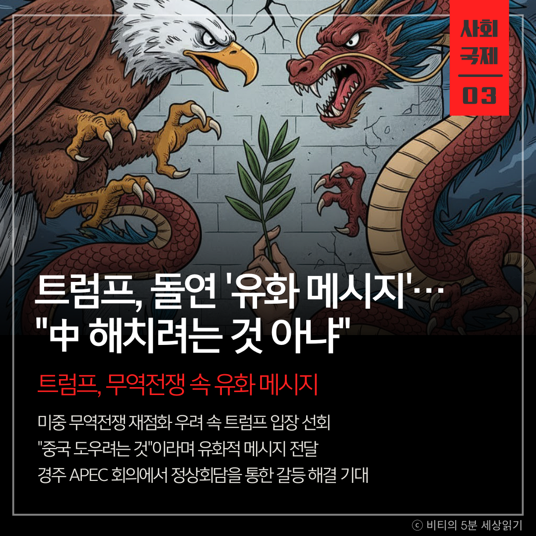 미중 무역전쟁 재점화 우려 속 트럼프 대통령이 "중국을 도우려 한다"는 유화적 메시지를 냈다. 경주 APEC 정상회담에서의 대화를 통한 갈등 해결 가능성을 시사한 것으로 풀이된다.