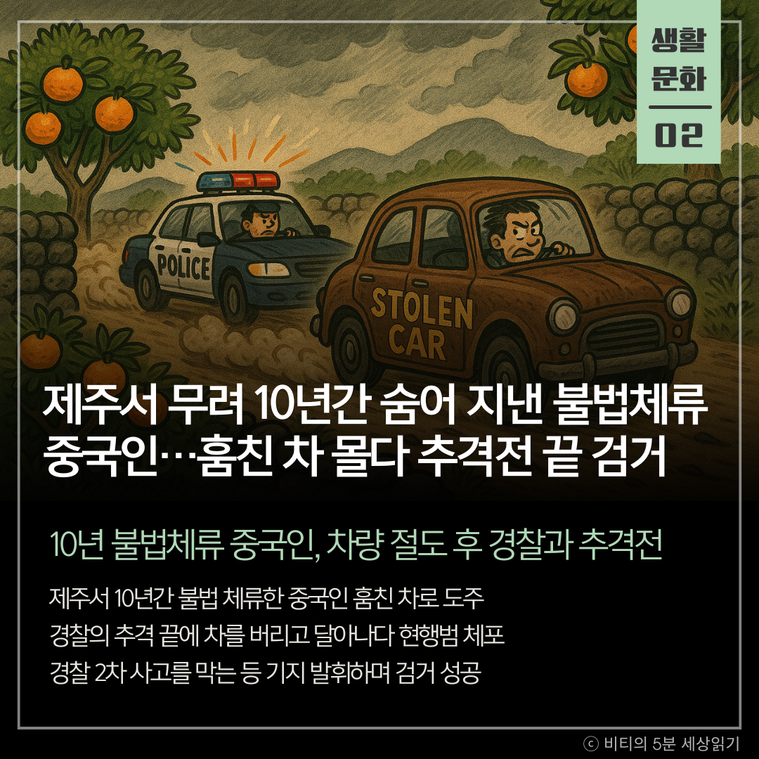 제주에서 10년 동안 불법으로 체류하던 중국인이 훔친 차량을 몰다가 경찰과 추격전을 벌인 끝에 붙잡혔습니다. 서귀포경찰서는 지난 6일 오후, 파손 흔적이 있는 차량을 보고 정지 신호를 보냈으나, 운전자 A씨는 이를 무시하고 약 2km를 질주하며 도주했습니다.