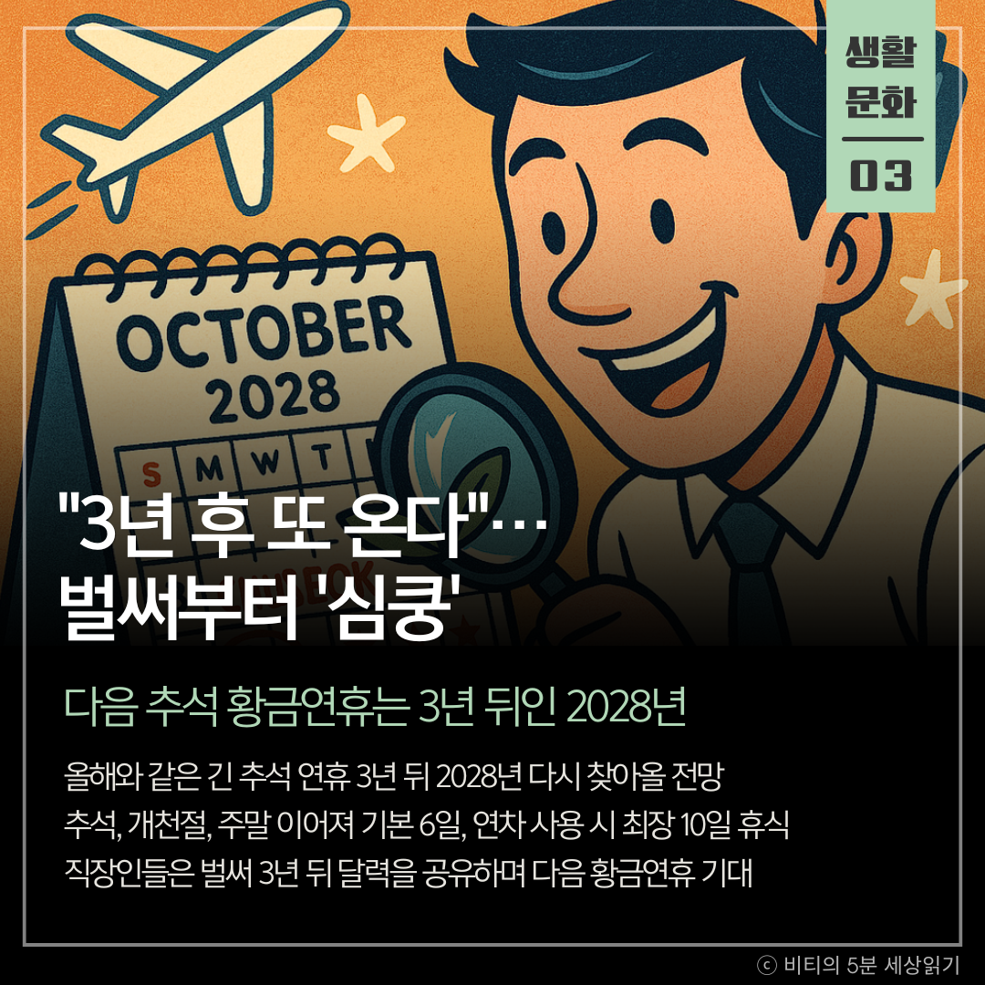 이런 '황금연휴'는 향후 10년간 언제 또 찾아올까요? 3년 후인 2028년 추석 연휴가 개천절과 겹치면서 기본 연휴가 6일이 됩니다. 이때 금요일(10월 6일)에 하루 휴가를 내면 주말과 한글날까지 이어져 올해처럼 최장 10일의 연휴를 즐길 수 있습니다.