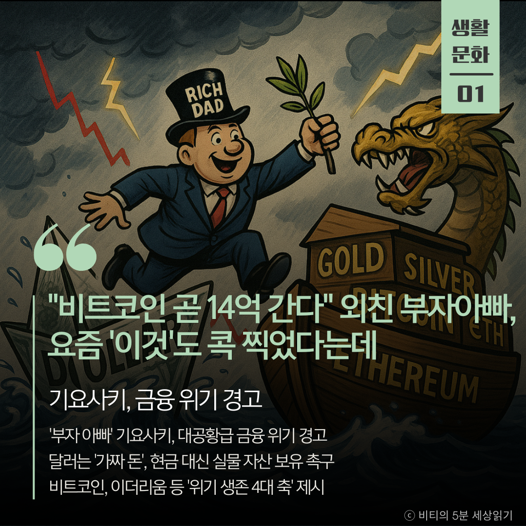 '부자 아빠' 기요사키가 대공황급 금융 위기를 경고하며 미국 달러를 '가짜 돈'이라 비판했다. 그는 현금 대신 금, 은, 비트코인, 이더리움을 '위기 생존 4대 축'으로 제시하며 투자를 강조했다.