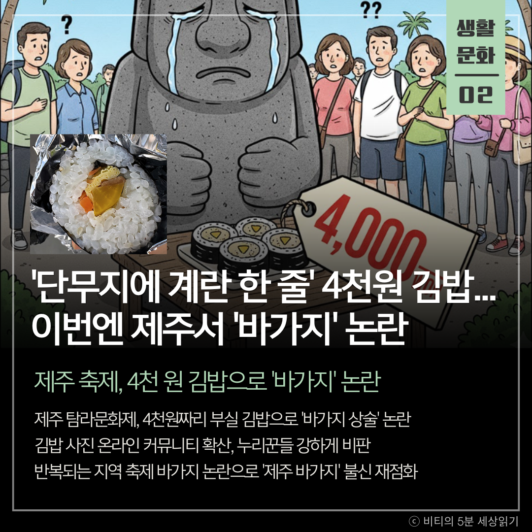 제주 탐라문화제에서 판매된 4,000원짜리 김밥이 지나치게 부실하다는 지적이 온라인에서 제기되며 '바가지 상술' 논란이 불거졌다. 지난 4월 제주 왕벚꽃 축제에 이은 지역 축제의 반복적인 고가 논란으로 '제주 바가지'에 대한 불신이 다시 불붙고 있다.