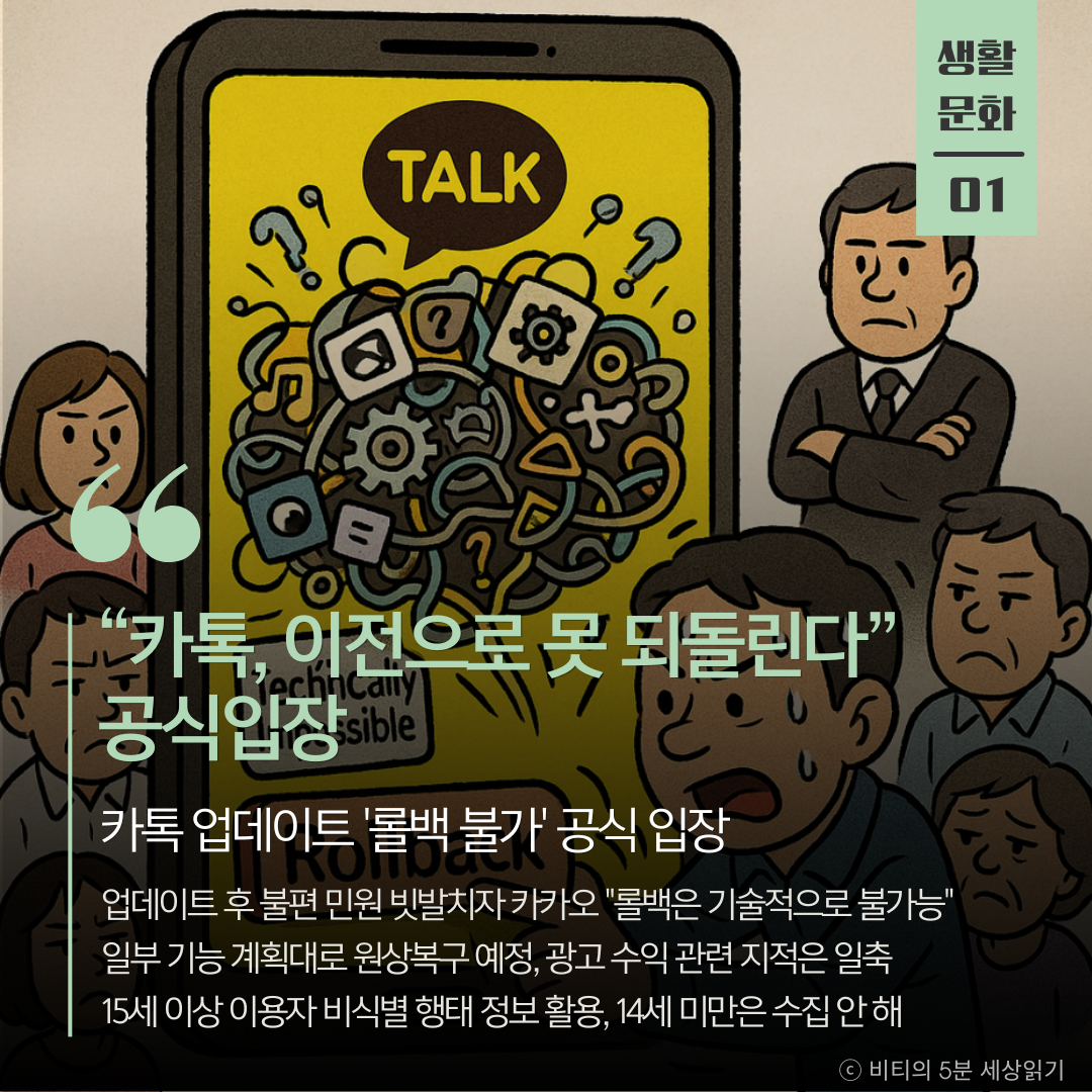국민 메신저 카카오톡 업데이트 이후 빗발친 불편 민원에 대해 카카오 측이 '롤백(원상복구)'은 기술적으로 불가능하다는 공식 입장을 밝혔다. 다만, 일부 기능은 계획대로 원상복구될 예정이며, 광고 수익 때문에 롤백하지 않는다는 지적은 사실이 아니라고 일축했다.