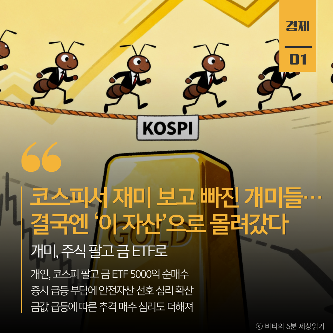 코스피가 역대 최고점을 경신해도 개인 투자자들은 '의심의 벽'을 넘지 못하고 안전자산으로 향하고 있습니다. 이는 국내 증시의 상승 동력에 대한 불신이 여전히 깊다는 것을 보여주는 신호입니다.