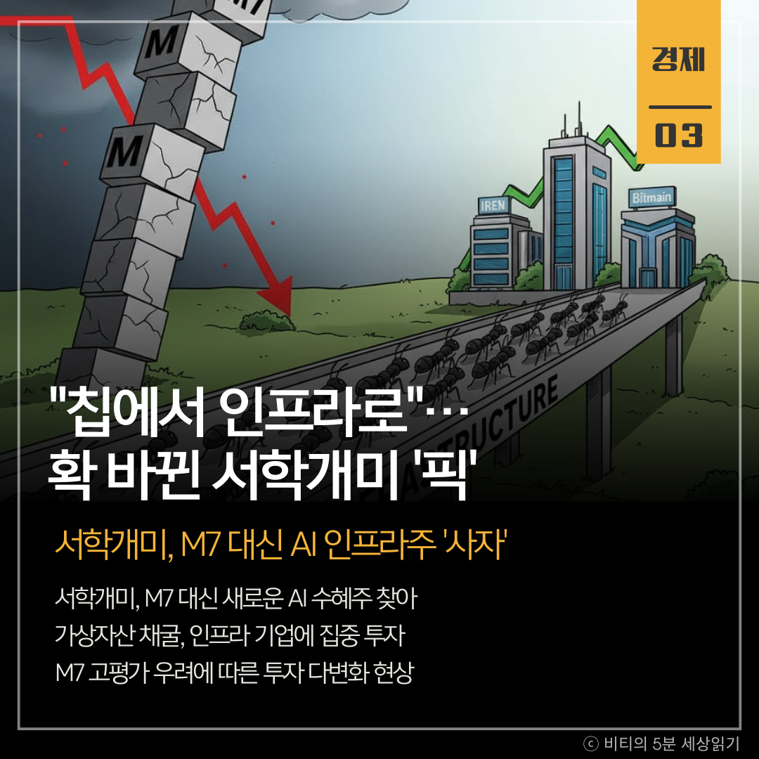 미국 주식에 투자하는 서학개미들이 M7 대신 AI 클라우드, 가상자산 인프라 등 새로운 AI 수혜주를 찾아 나서고 있다. M7의 고평가 우려가 커지자 아이렌, 비트마인 등 관련 종목에 대한 투자가 급증했다.