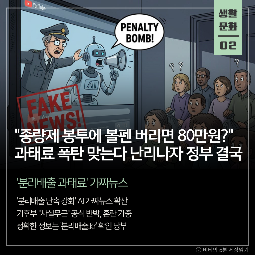 유튜브를 중심으로 '쓰레기 분리배출 단속이 강화돼 수십만원의 과태료가 부과된다'는 AI 제작 가짜뉴스 영상이 확산하며 시민들의 혼란을 키우고 있다. 기후에너지환경부는 "사실무근"이라며 공식 반박에 나섰다.
