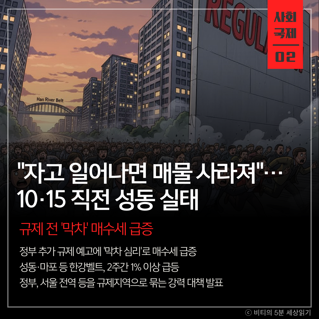 정부의 추가 규제 예고에 '막차' 심리가 확산되며 서울 한강벨트 집값이 급등하자, 정부가 서울 전역을 규제지역으로 묶는 등 강력한 대책을 발표했다. 하지만 대책 효과는 2~3개월에 그치고 강남 쏠림 현상이 심화될 것이라는 우려가 나온다.