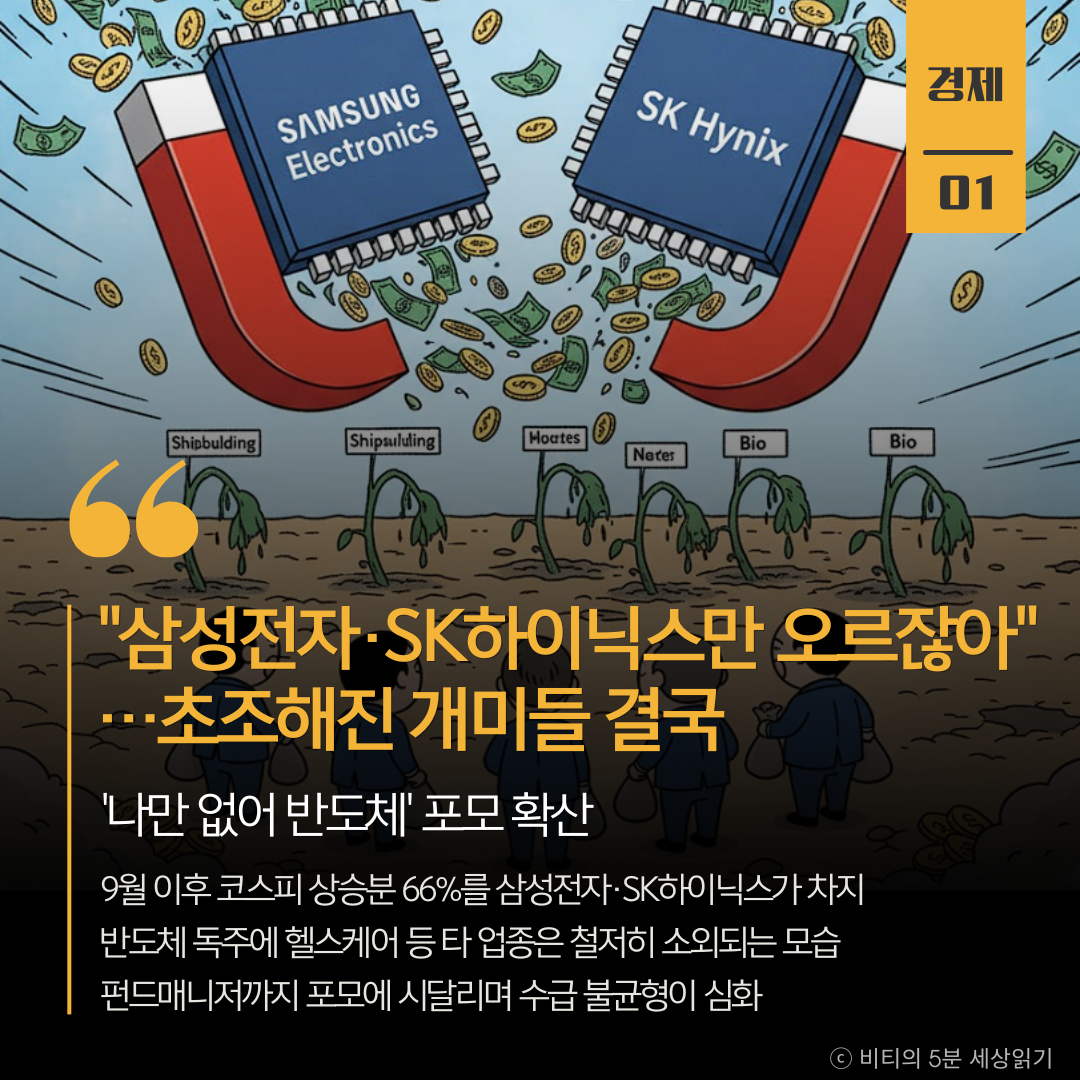 9월 이후 코스피 상승분의 66%를 삼성전자와 SK하이닉스가 차지하며 극심한 쏠림 현상이 나타났다. 반도체 독주에 타 업종은 소외되며 투자자들의 '포모(FOMO)'가 확산되고 있다.