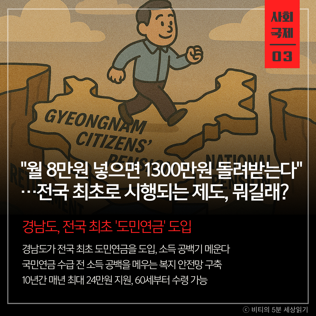 경상남도가 전국 최초로 국민연금 수급 전 소득 공백을 메우기 위한 '경남도민연금'을 내년 1월부터 시행한다. 만 40~54세 도민을 대상으로 10년간 연 최대 24만원을 지원해 노후 소득을 보장하는 새로운 복지 안전망이다.
