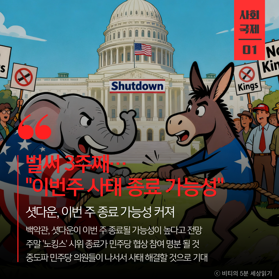 미국 백악관이 연방정부 셧다운 사태가 이번 주 중 종료될 가능성이 높다고 전망했다. 지난 주말 트럼프 대통령에 반대하는 대규모 '노킹스(No Kings)' 시위가 끝나면서, 민주당이 정치적 부담을 덜고 예산안 처리에 협조할 명분이 생겼다는 분석이다.
