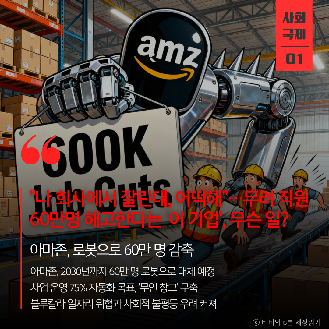 아마존이 2030년까지 60만 명을 로봇으로 대체하는 구조조정에 나선다. AI와 로봇 자동화가 블루칼라 일자리에 미칠 충격과 사회적 불평등 우려가 제기된다.