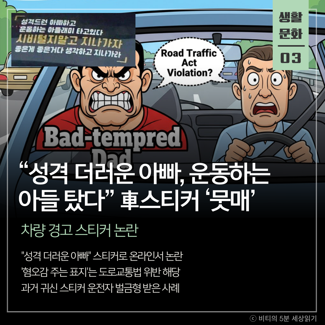 "성격 더러운 아빠하고 운동하는 아들이 타고 있다"는 문구를 차량 뒷유리에 붙인 차주가 온라인 커뮤니티에서 뭇매를 맞았습니다. '초보운전'이나 '아기가 타고 있어요'를 넘어, 다른 운전자에게 위협을 주는 경고성 스티커가 눈살을 찌푸리게 한다는 비판입니다. 현행 도로교통법은 혐오감을 주는 도색이나 표지를 금지하고 있으며, 실제로 2017년 귀신 스티커를 붙인 운전자가 벌금 10만 원을 선고받은 사례도 있습니다.