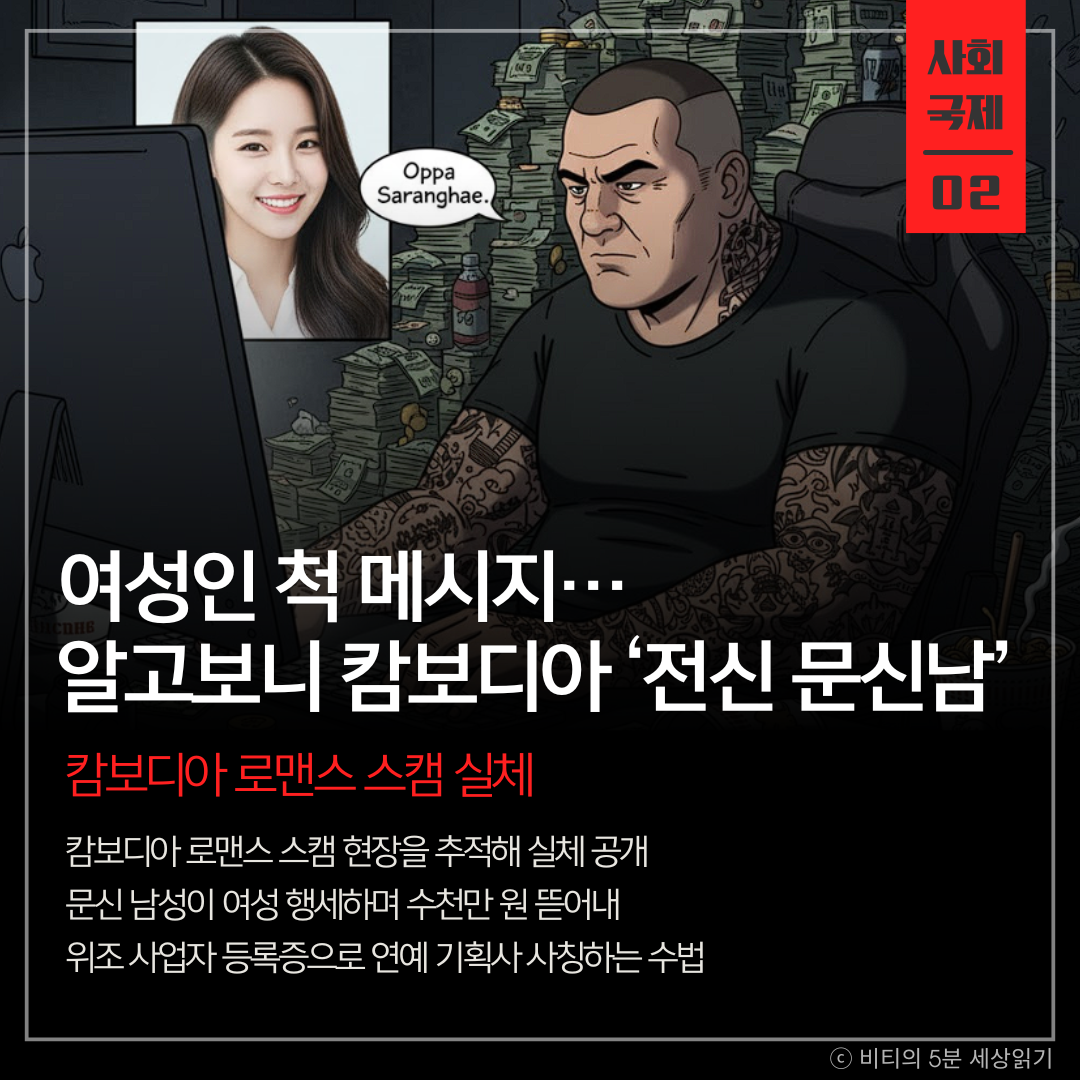 캄보디아의 한 사기 범죄 현장이 KBS 취재진에 의해 드러났습니다. 이른바 '로맨스 스캠' 조직의 근거지로, 온몸에 문신을 한 남성들이 사진을 도용해 여성인 척하며 피해 남성들에게 접근했습니다. 이들은 조직 전체를 연예 기획사로 위장하고 위조 사업자 등록증까지 보여주며 신뢰를 얻은 뒤, 수천만 원을 가로챘습니다. 피해자들은 극심한 정신적 고통을 호소하고 있으며, 현재 이들 조직원에 대한 수사가 진행 중입니다.