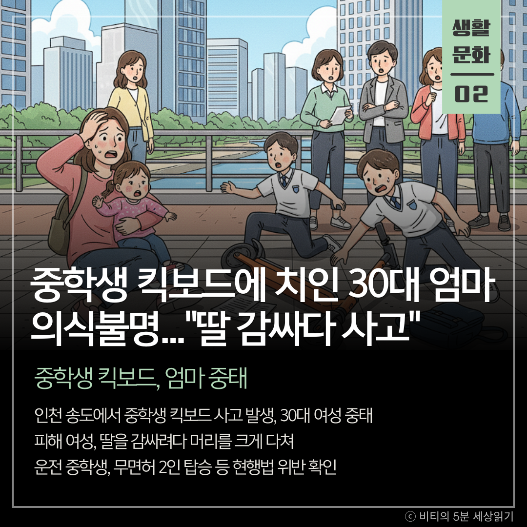 인천 송도에서 중학생 2명이 탄 전동킥보드에 30대 여성이 부딪혀 중태에 빠졌다. 피해 여성은 어린 딸을 보호하려다 머리를 크게 다친 것으로 전해졌으며, 킥보드를 운전한 중학생은 면허도 없고 2인 탑승 원칙도 위반한 것으로 확인됐다.