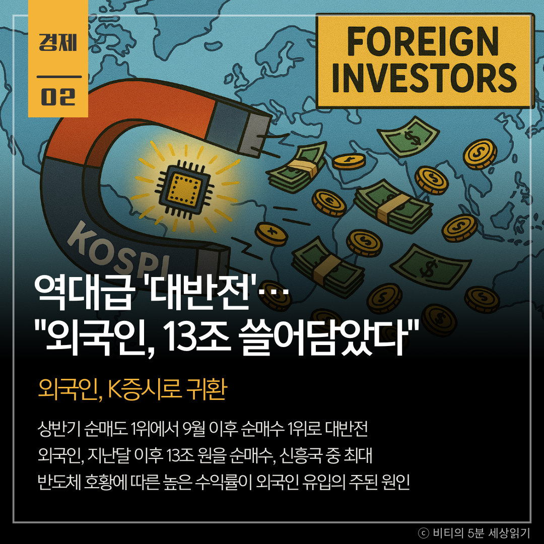 올해 상반기 한국 증시를 외면했던 외국인 투자자들이 9월 이후 13조 원을 순매수하며 돌아왔다. 이는 반도체 호황에 따른 높은 수익률 때문으로, 주요 신흥국 중 최대 규모다.