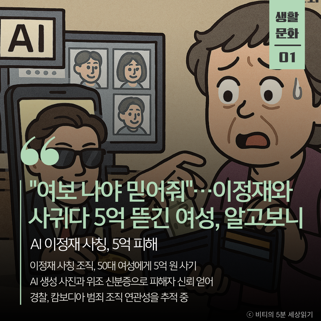 배우 이정재를 사칭한 로맨스 스캠 조직이 AI 기술로 만든 가짜 사진과 위조 신분증을 이용해 50대 여성에게 5억 원을 가로챘다. 경찰은 캄보디아 소재 조직과의 연관성을 수사 중이다.