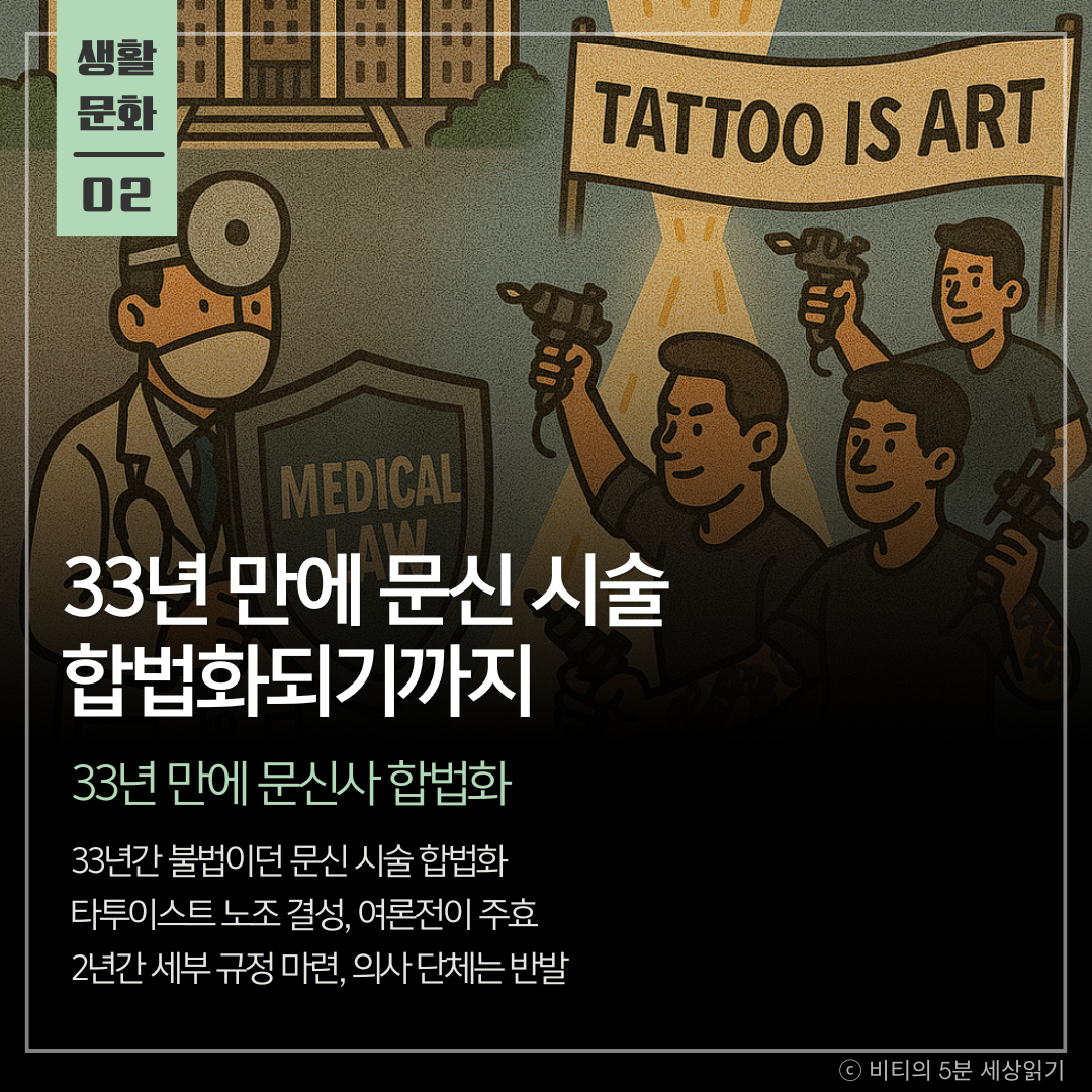 33년간 불법 의료 행위로 취급받던 비의료인의 문신 시술이 마침내 합법화됐다. 타투이스트들이 노동조합을 결성해 벌인 조직적인 운동과 여론전이 의사 단체의 반발을 넘어 법제화를 이끌어낸 핵심 동력이었다.