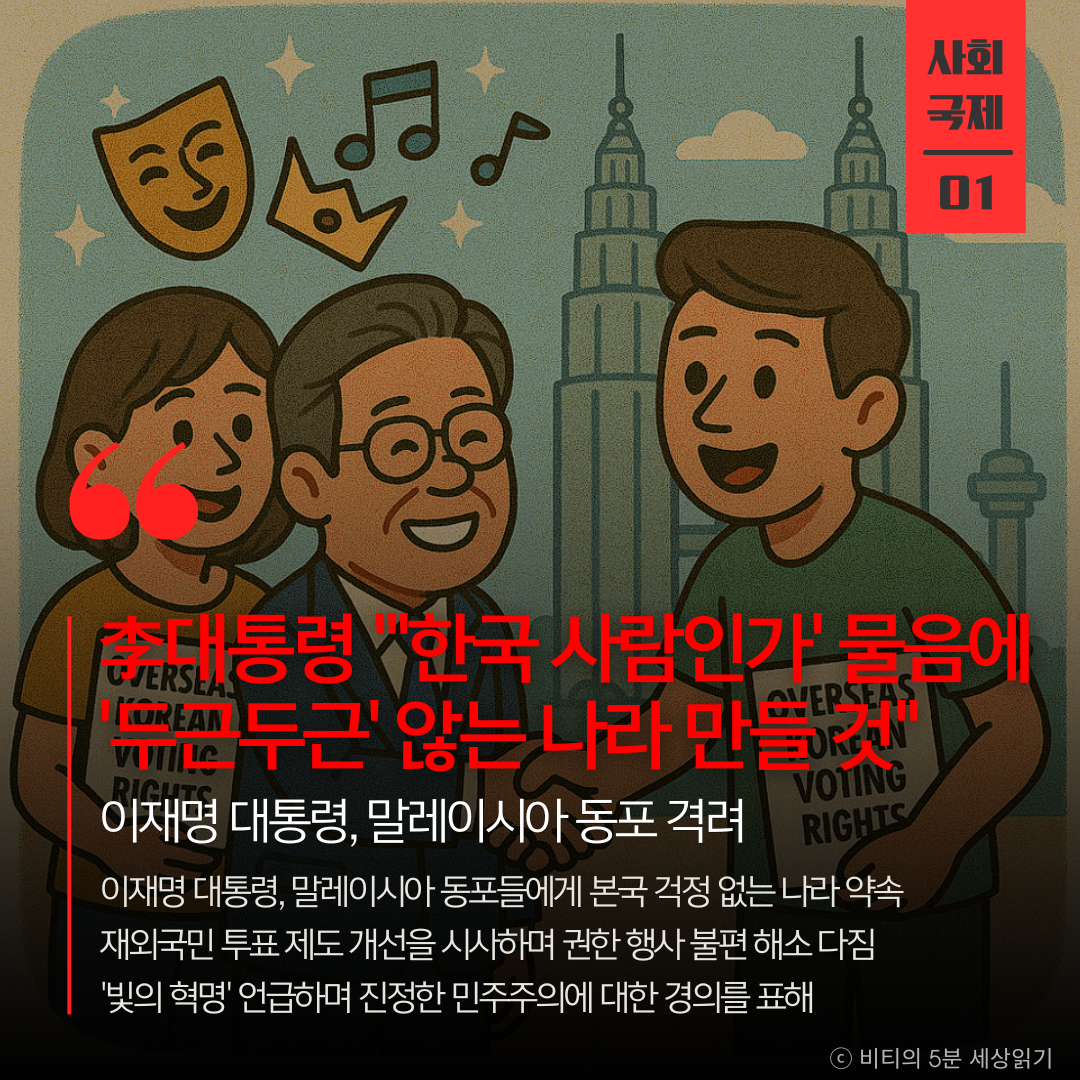 이재명 대통령이 말레이시아 동포 간담회에서 "본국을 걱정하지 않는 나라"를 만들겠다고 약속하며 재외국민 투표 제도 개선을 시사했다. '빛의 혁명'을 언급하며 민주주의 회복에 대한 자부심도 드러냈다.