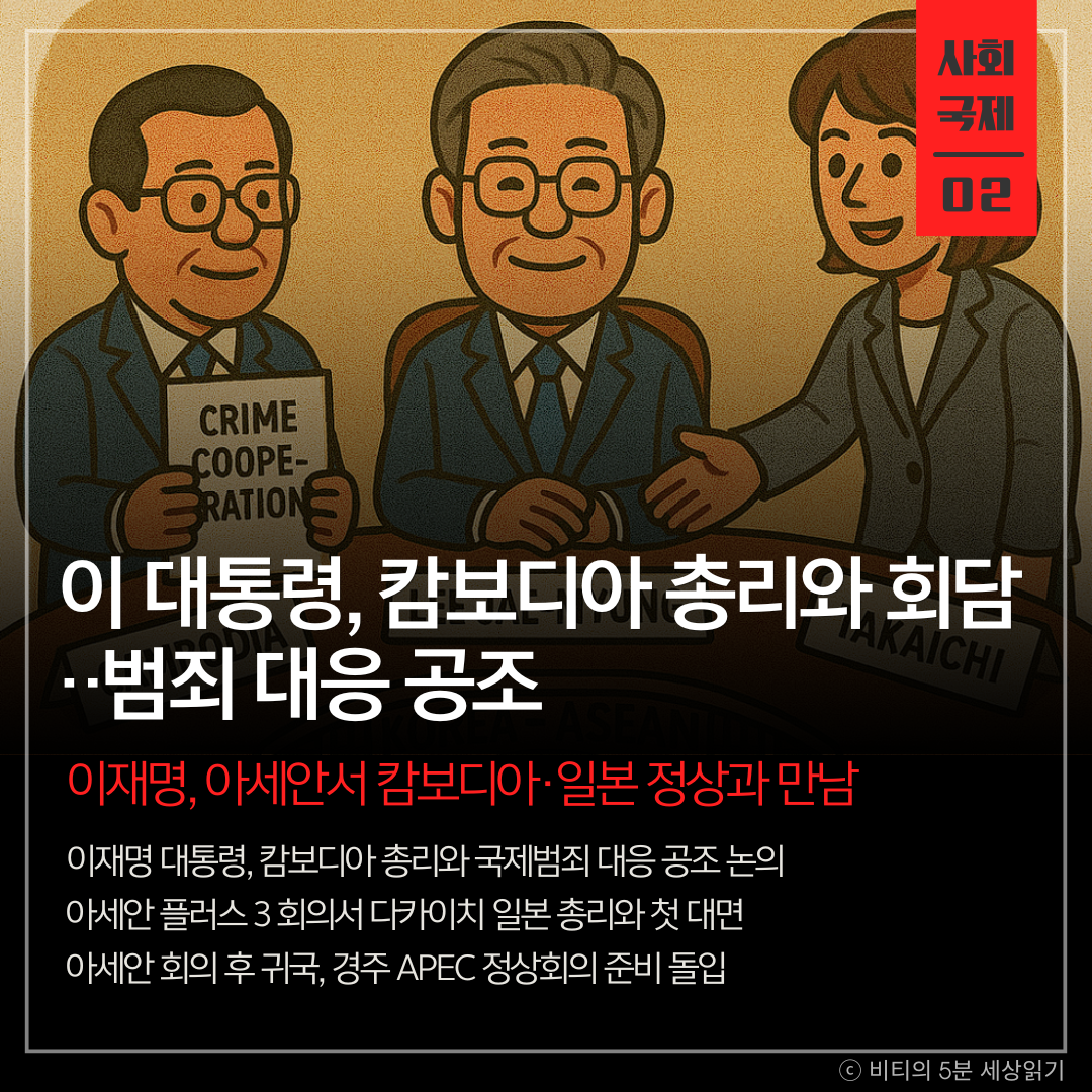 이번 아세안 순방은 캄보디아 국제범죄 문제 해결의 실마리를 찾고, 강경 우익 성향의 일본 신임 총리와의 첫 만남을 통해 한일 관계의 향방을 가늠할 중요한 외교적 시험대입니다.