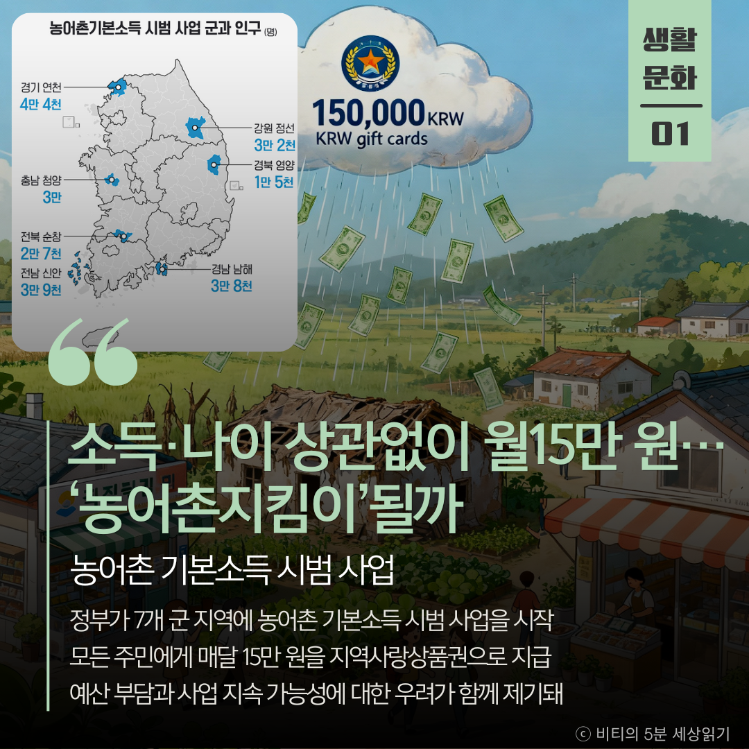 정부가 인구 감소 지역 7곳에 '농어촌 기본소득' 시범 사업을 시작한다. 모든 주민에게 매달 15만 원을 지급해 지역 소멸 위기에 대응하고 경제 활성화를 꾀한다는 계획이다.