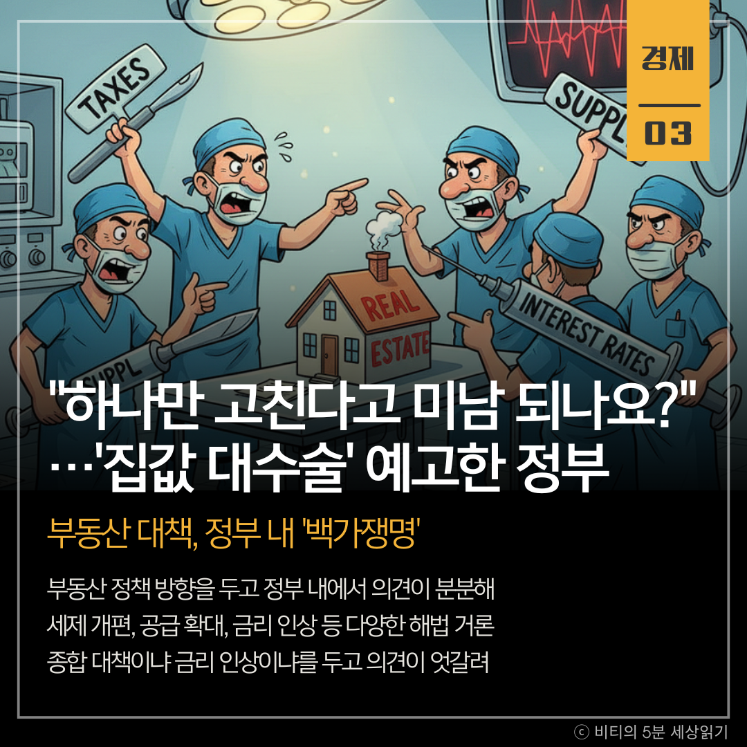 부동산 문제를 두고 정부 내에서도 뾰족한 해법을 찾지 못하고 '백가쟁명'이 벌어지고 있습니다. 시장의 신뢰를 얻으려면 단편적인 규제가 아닌, 일관되고 종합적인 정책 시그널이 필요합니다.