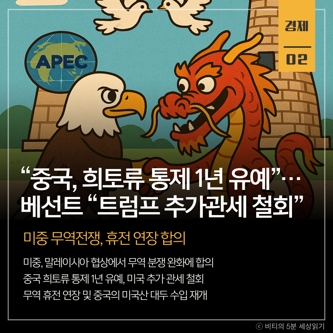 미국과 중국이 무역 분쟁 완화에 사실상 합의했다. 중국은 희토류 수출 통제를 1년간 유예하고, 미국은 예고했던 100% 추가 관세를 철회하기로 했다. 이번 합의로 경주 APEC 정상회담을 앞두고 양국 간 긴장이 완화될 전망이다.