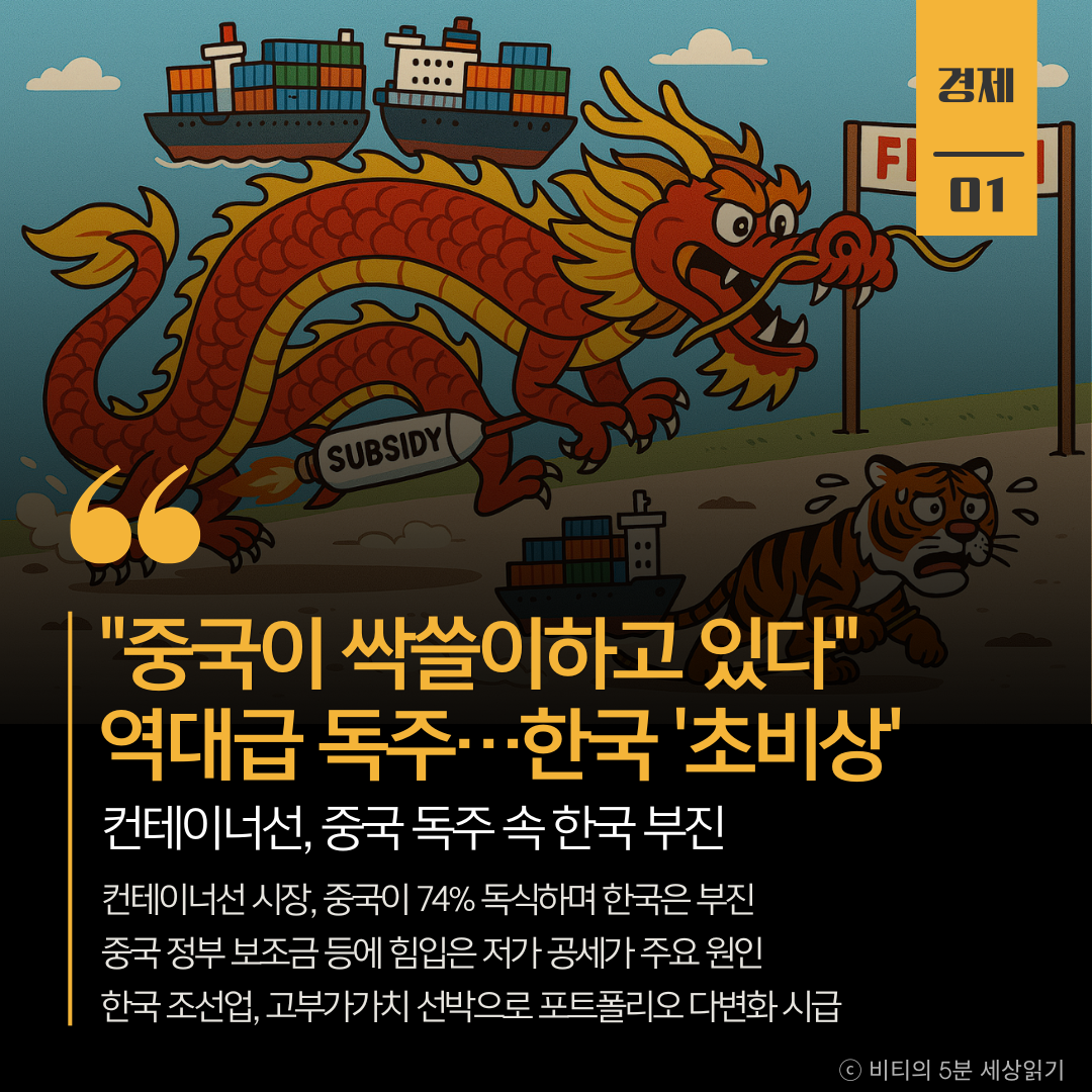 중국 조선사들이 글로벌 컨테이너선 시장을 싹쓸이하고 있습니다. 최근 발주된 컨테이너선의 74%를 중국이, 한국은 20%를 확보하는 데 그쳤습니다. 중국 정부의 대규모 보조금과 자국 해운사의 발주 몰아주기에 힘입은 저가 공세 때문입니다. 국내 조선 3사는 영업을 강화하고 있지만 수익성 악화가 우려되는 상황입니다. 전문가들은 해양플랜트 등 고부가가치 선박으로 포트폴리오를 다변화해야 한다고 조언합니다.