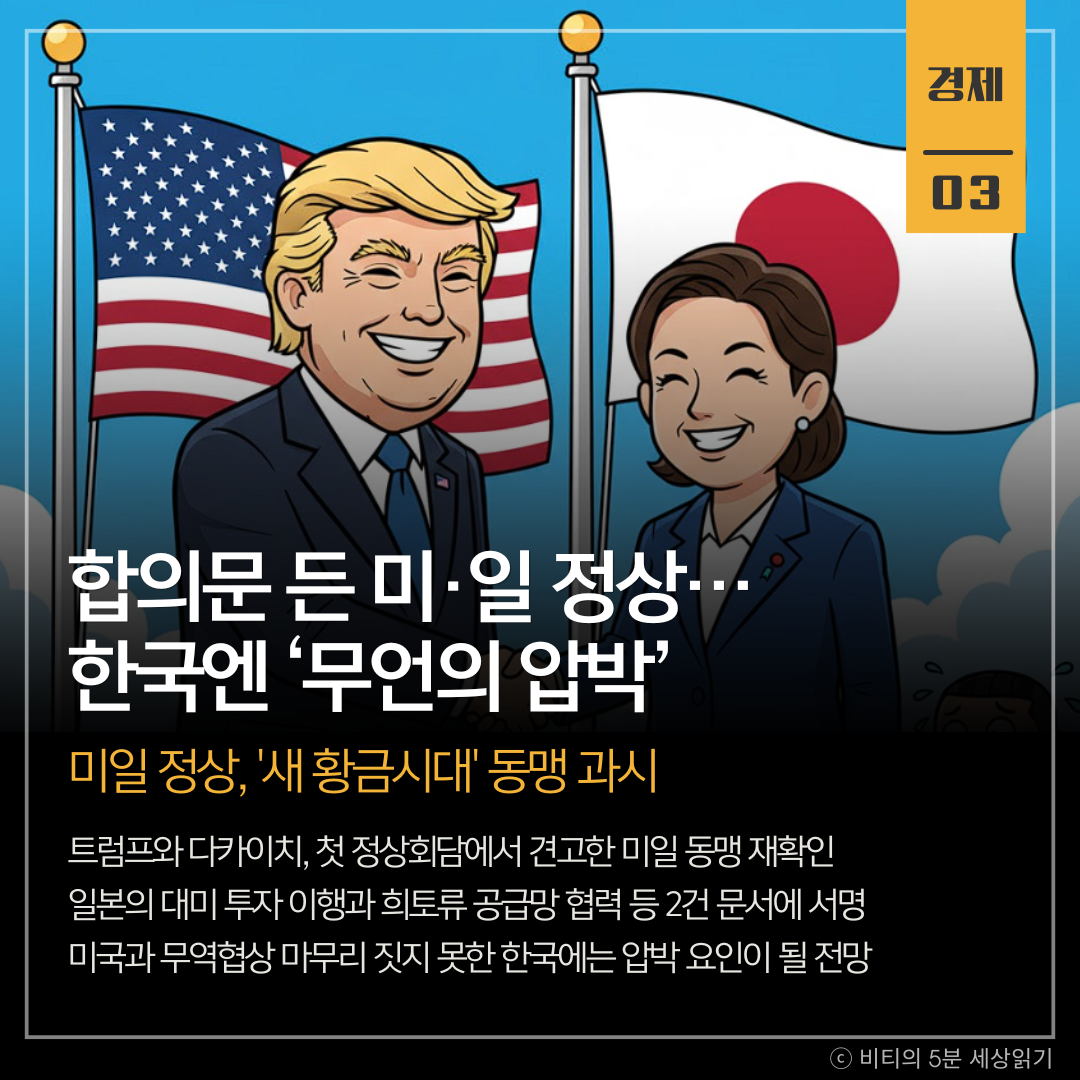 도널드 트럼프 미국 대통령과 다카이치 사나에 일본 총리가 첫 정상회담에서 무역 합의 이행과 희토류 공급망 협력을 약속하며 견고한 미일 동맹을 과시했다. 이는 아직 미국과 무역 협상을 마무리 짓지 못한 한국에 압박 요인이 될 전망이다.