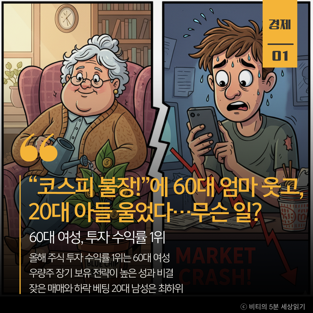 올해 주가 급등 장세에서 60대 이상 여성 투자자가 '우량주 장기 보유' 전략으로 최고 수익률을 달성했다. 반면 20대 남성은 잦은 매매와 하락 베팅으로 수익률 최하위를 기록하며, 투자 전략의 중요성을 보여줬다.