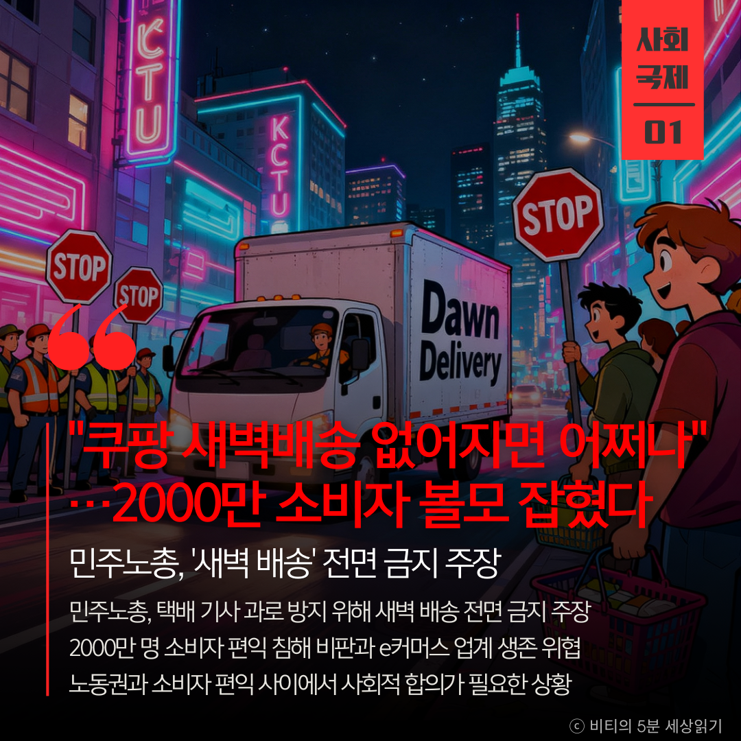 민주노총이 택배 기사 과로 방지를 이유로 '새벽 배송'전면 금지를 요구했다. 그러나 2000만 명이 이용하는 생활 인프라로 자리 잡은 새벽 배송을 막는 것은 소비자 편익을 침해한다는 비판과 함께, 쿠팡 등 e커머스 업계의 생존을 위협할 수 있다는 우려가 나온다.