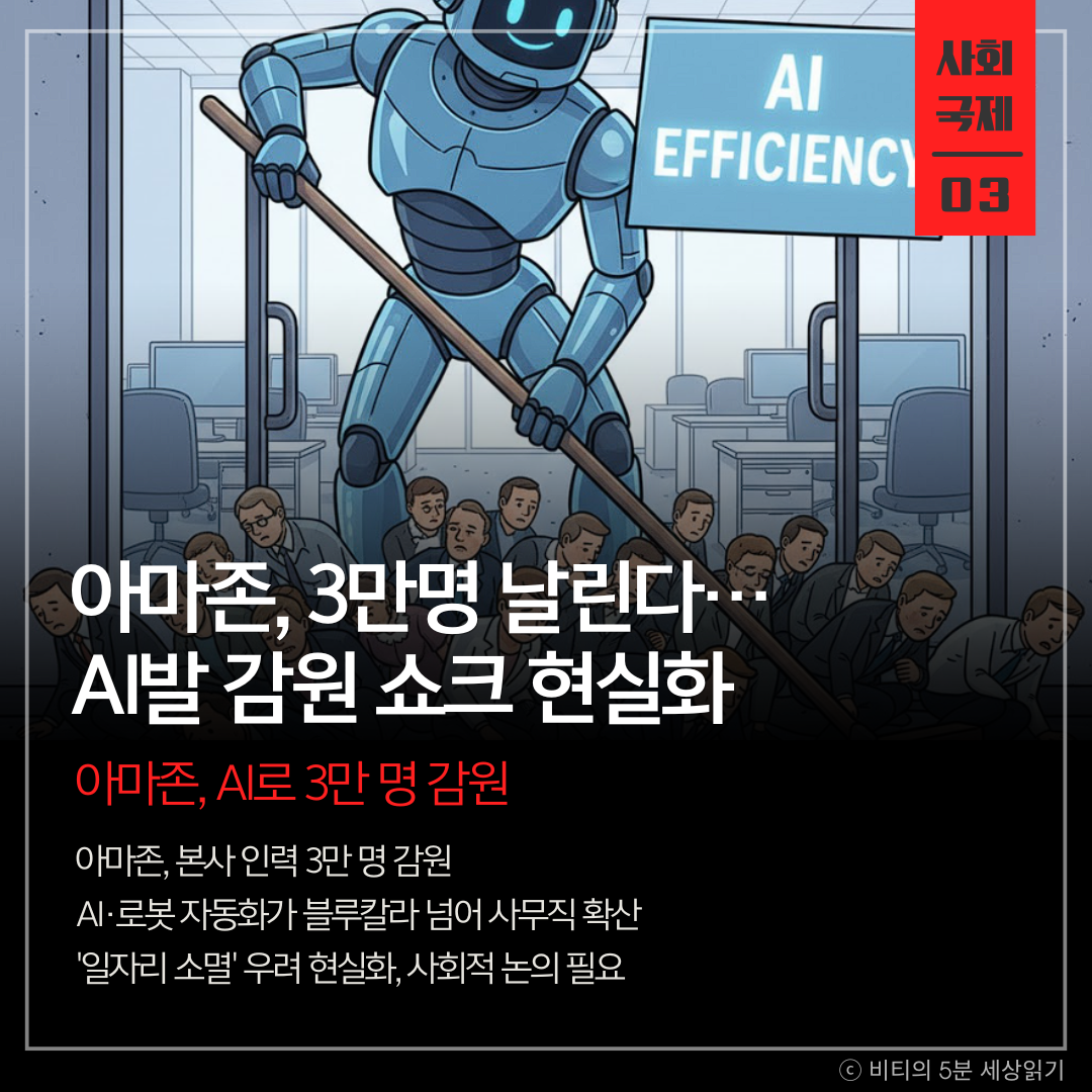 아마존이 역대 최대 규모인 3만 명의 본사 인력을 감원하기로 했다. 로봇과 AI 기술 고도화에 따른 인력 감축이 블루칼라를 넘어 사무직까지 확산되며 '일자리 소멸' 우려가 현실화되고 있다.