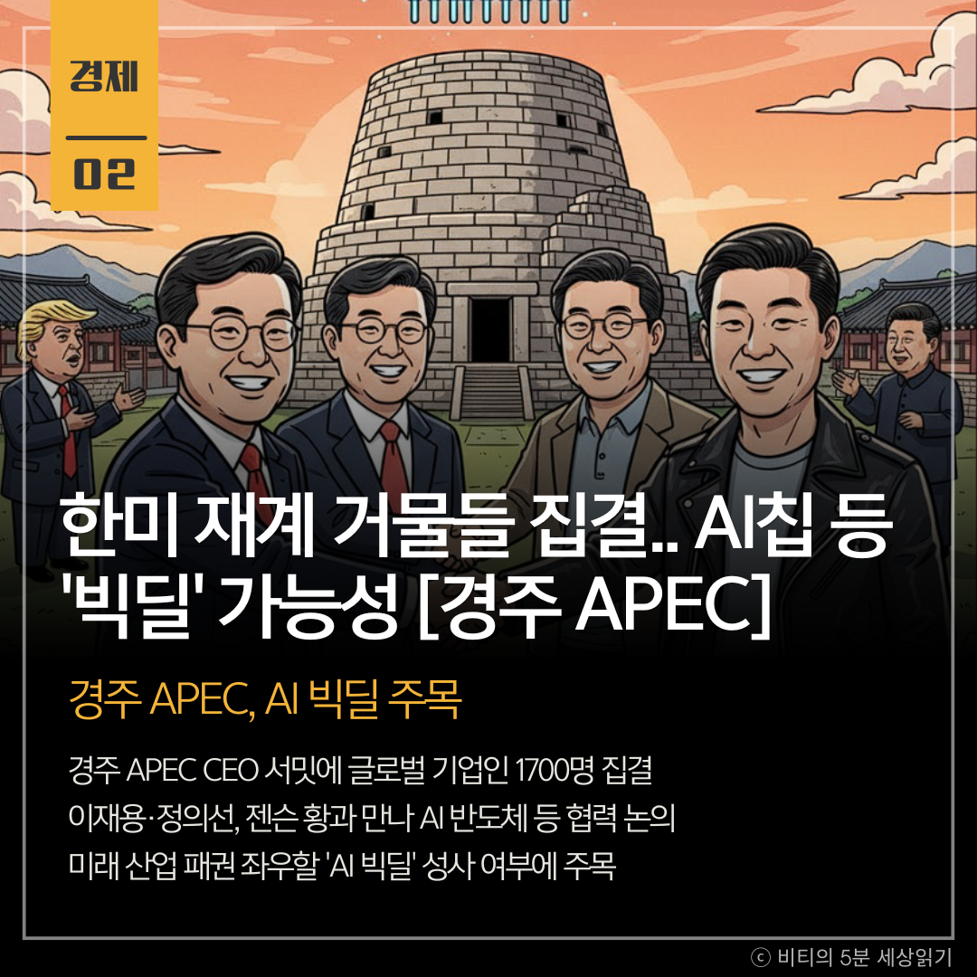 APEC CEO 서밋이 경주에서 개막하며 1700여 명의 글로벌 기업인들이 집결했습니다. 특히 이재용 삼성전자 회장과 정의선 현대차그룹 회장은 30일 서울에서 젠슨 황 엔비디아 CEO와 만찬 회동을 갖고 AI 반도체, 로보틱스 등 구체적인 협력을 논의할 예정입니다. 이는 이달 초 샘 올트먼 오픈AI CEO와의 회동에 이은 두 번째 'AI 빅딜' 논의로, 미래 산업 패권을 둘러싼 합종연횡이 주목됩니다.