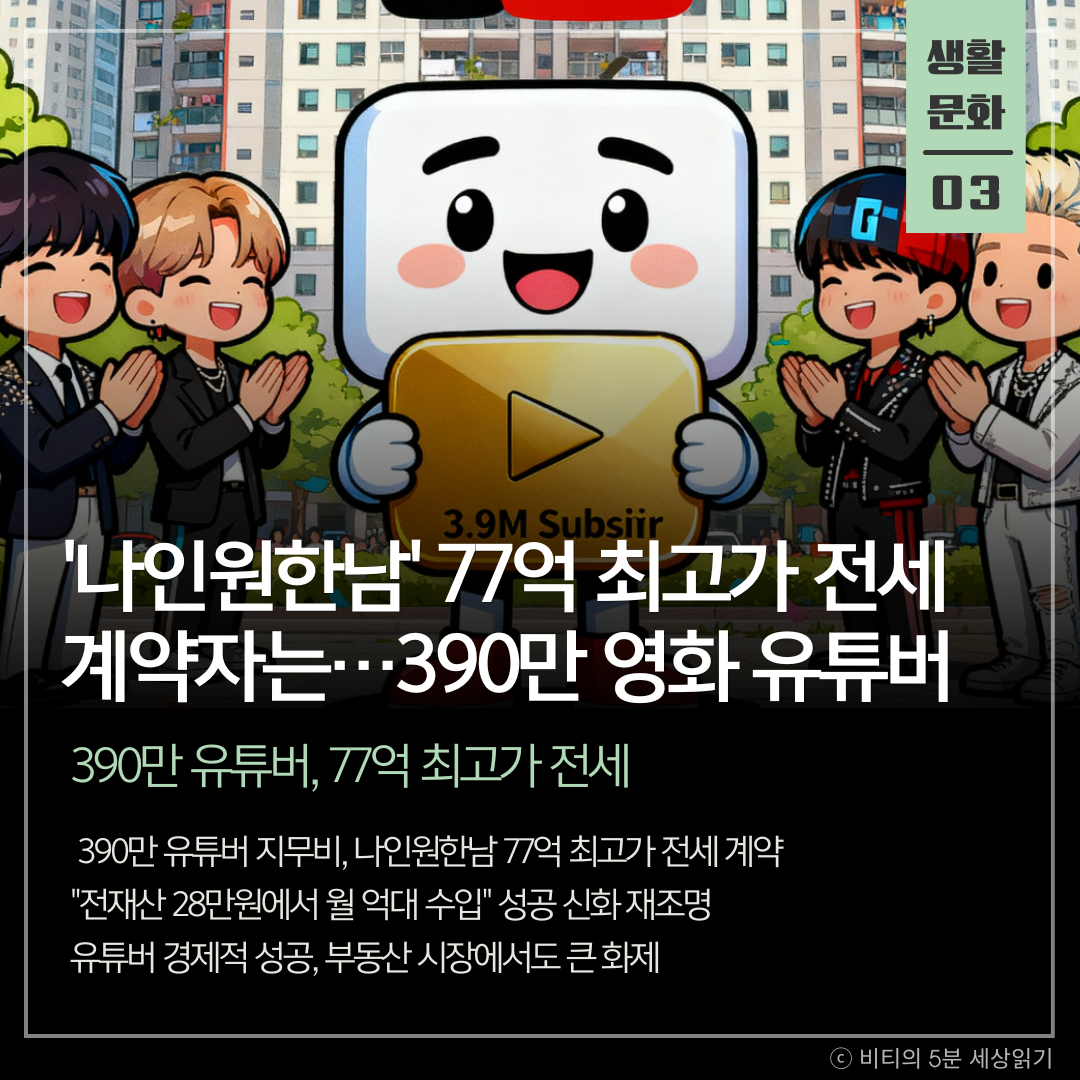 구독자 390만 명을 보유한 영화 리뷰 유튜버 '지무비'가 서울 용산구 '나인원한남'의 75평을 77억 원에 전세 계약하며 최고가를 기록했다. 그는 과거 "전 재산 28만원으로 시작해 은행원 연봉 4배를 번다"고 밝힌 바 있어, 유튜버의 성공이 부동산 시장에서도 화제가 되고 있다.