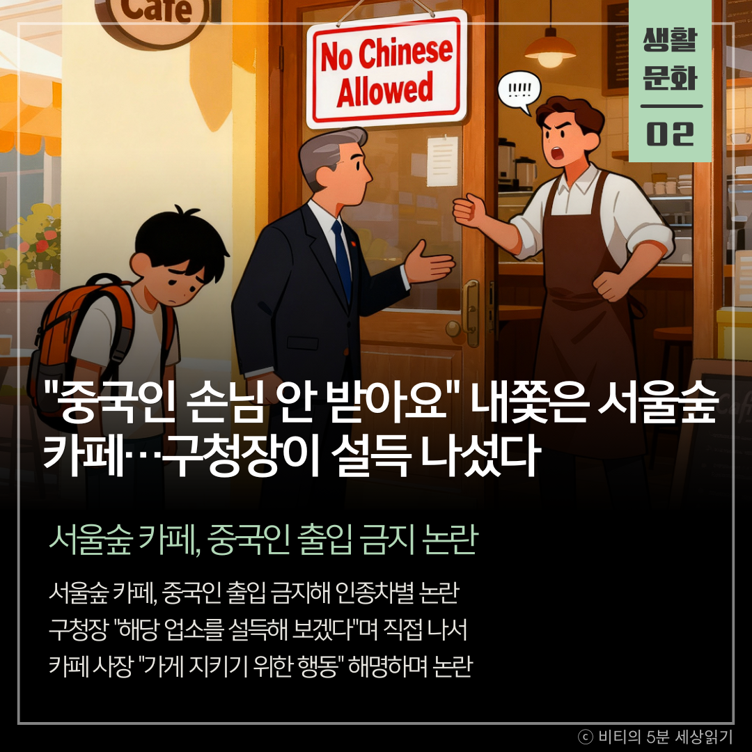 서울숲 인근의 한 카페가 '중국인 출입 금지'를 내걸어 인종차별 논란에 휩싸였다. 관할 구청장이 직접 나서 "해당 업소를 설득하겠다"고 밝히며, 대한민국 대표 관광지의 이미지 훼손을 우려했다.