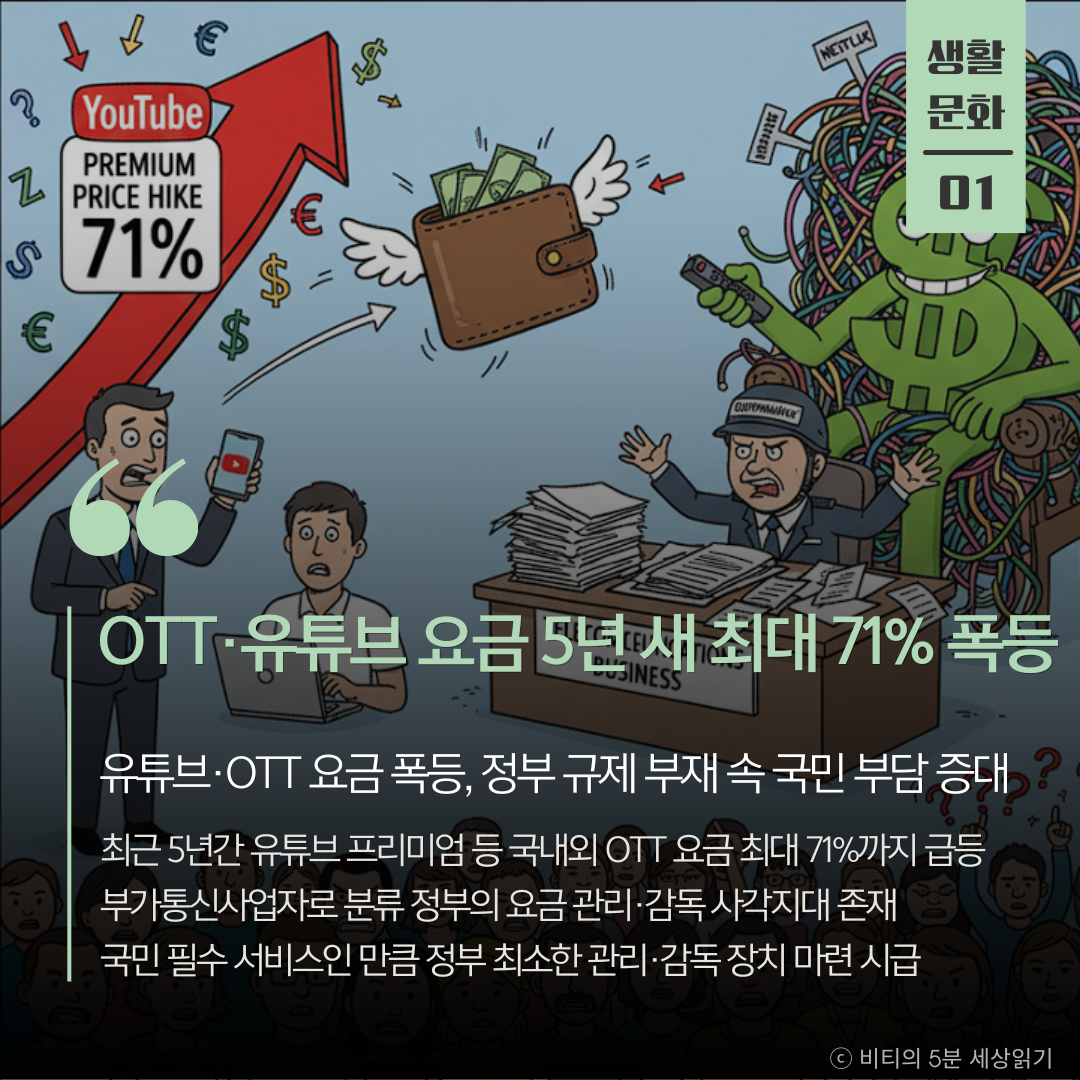 유튜브 프리미엄, 넷플릭스 등 OTT 요금이 5년간 최대 71% 폭등하며 국민 부담이 커졌다. OTT가 필수 서비스로 자리 잡았음에도 요금 인상 시 정부의 규제 대상에서 제외되어 관리·감독의 사각지대라는 비판이 제기된다.