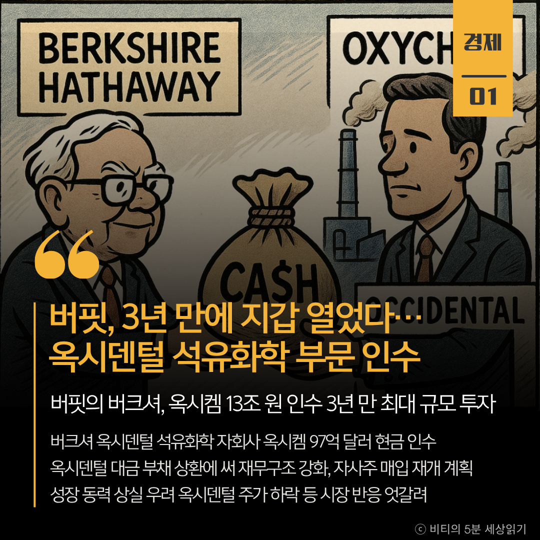 '투자의 귀재' 워런 버핏이 이끄는 버크셔해서웨이가 옥시덴털페트롤리엄의 석유화학 자회사 옥시켐을 97억 달러(약 13조 6천억 원)에 전액 현금으로 인수합니다. 이는 버크셔가 2022년 이후 추진하는 최대 규모의 거래로, 버크셔의 사상 최대 현금 보유액(3,440억 달러)이 투입되는 사례입니다.