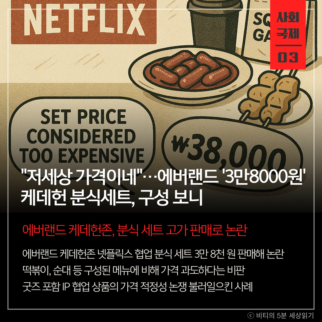 에버랜드가 넷플릭스 협업 '케데헌존'에서 판매하는 분식 세트 가격이 3만 8천 원으로 책정되어 논란이다. 굿즈 제공이 포함되었으나, 일반적인 구성에 비해 가격이 과도하다는 지적이 제기되며 테마파크 음식 가격에 대한 논쟁을 키우고 있다.