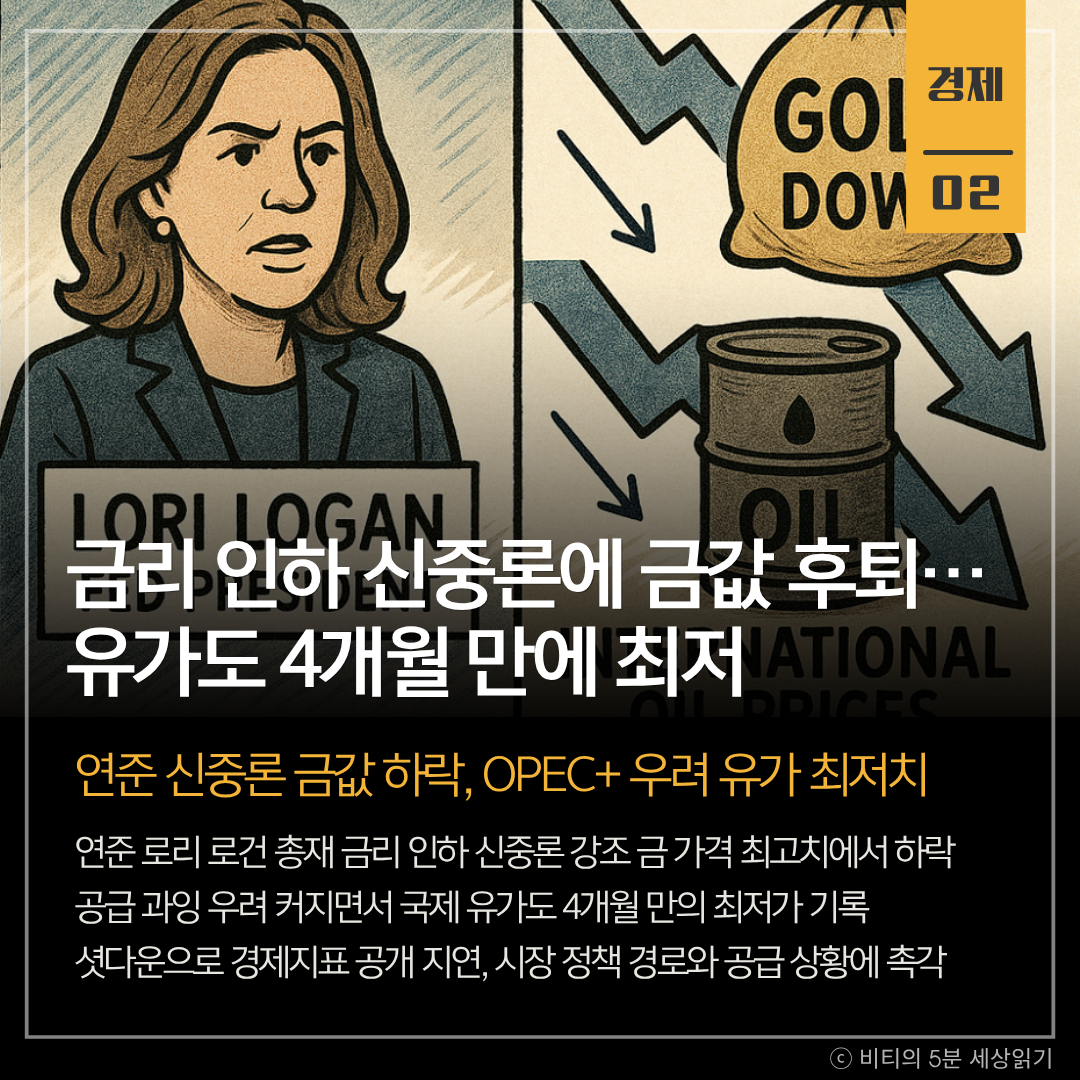 연준 위원의 금리 인하 신중론에 금값이 최고치에서 하락했다. 국제유가는 OPEC+ 회의를 앞두고 공급 과잉 우려가 커지며 4개월 만의 최저치를 기록하는 등, 단기적으로 안전자산과 원자재 시장 모두 약세를 보였다.