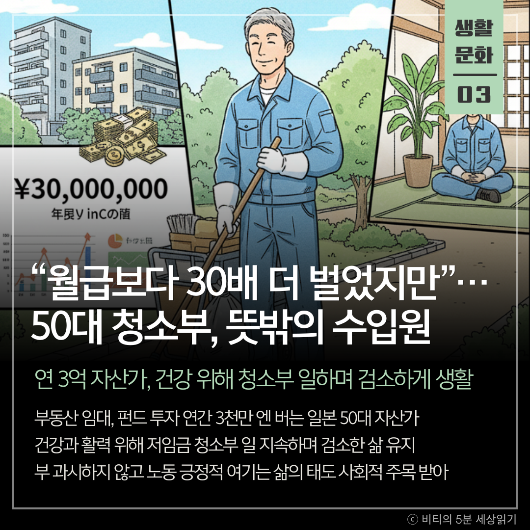 일본 도쿄에 거주하는 56세 마쓰바라 고이치 씨가 부동산 임대와 펀드 투자로 연간 3천만 엔(약 3억 원)의 수익을 올리는 자산가임에도 불구하고, 주 3일 청소부로 일하는 사연이 화제입니다. 그는 청소부 월급으로 도쿄 평균 급여의 3분의 1 수준인 약 100만 원만 받고 있습니다.