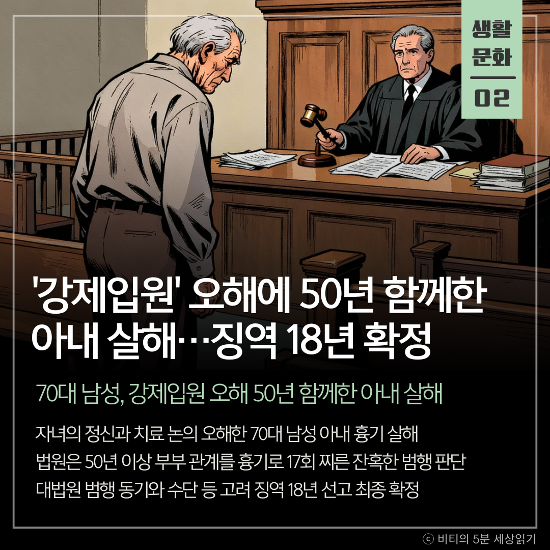 자신을 정신병원에 강제로 입원시키려 한다는 오해로 50년을 함께한 아내를 살해한 70대 남성이 대법원에서 최종 징역 18년형을 확정받았다. 대법원은 피고인이 1심에서 양형부당만을 주장한 이