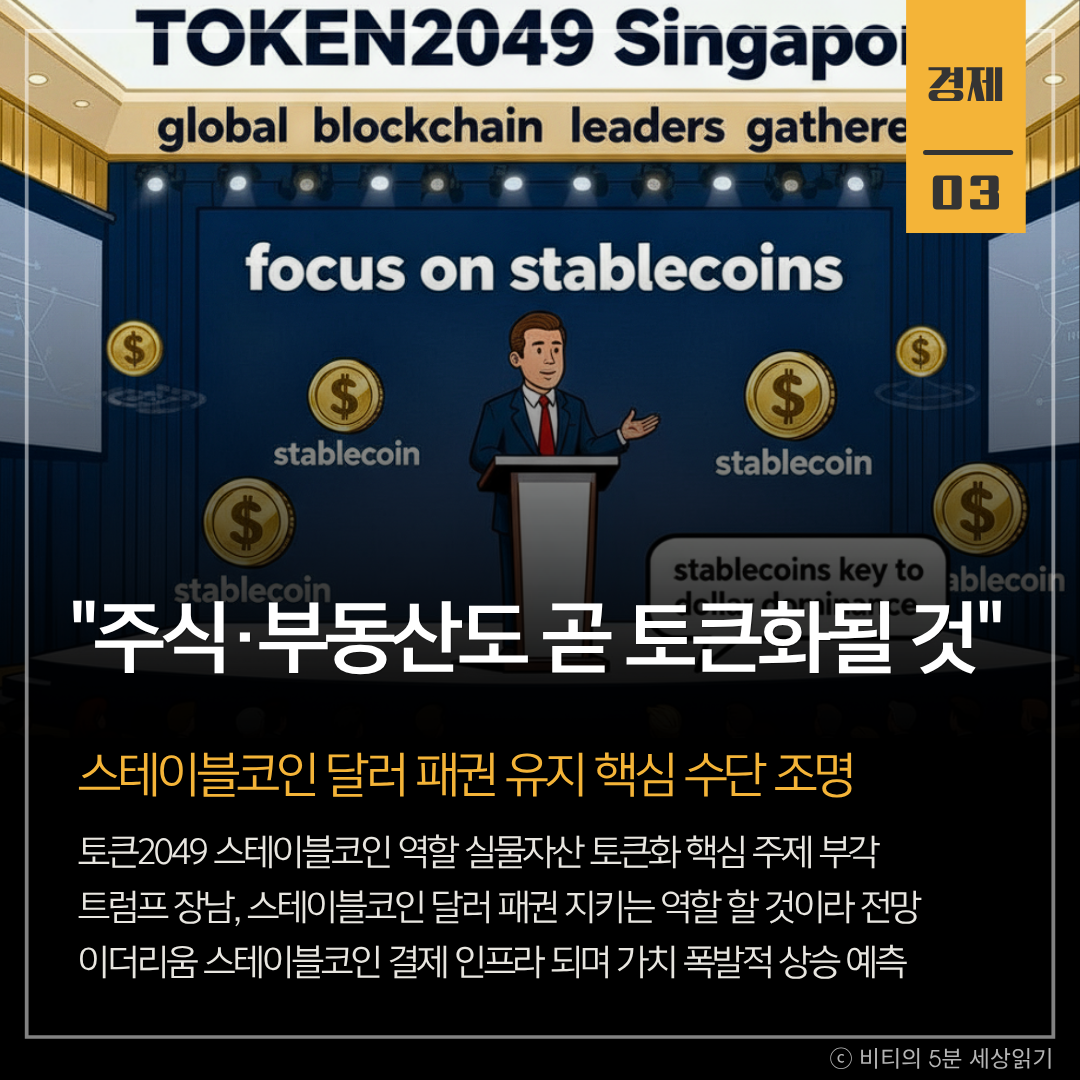 글로벌 최대 가상자산 컨퍼런스에서 스테이블코인이 가장 뜨거운 주제로 부각됐다. 트럼프 장남은 달러 패권을 지킬 최적의 수단으로 스테이블코인을 꼽았고, 전문가들은 실물자산 토큰화와 이더리움의 폭발적 성장을 예상했다.