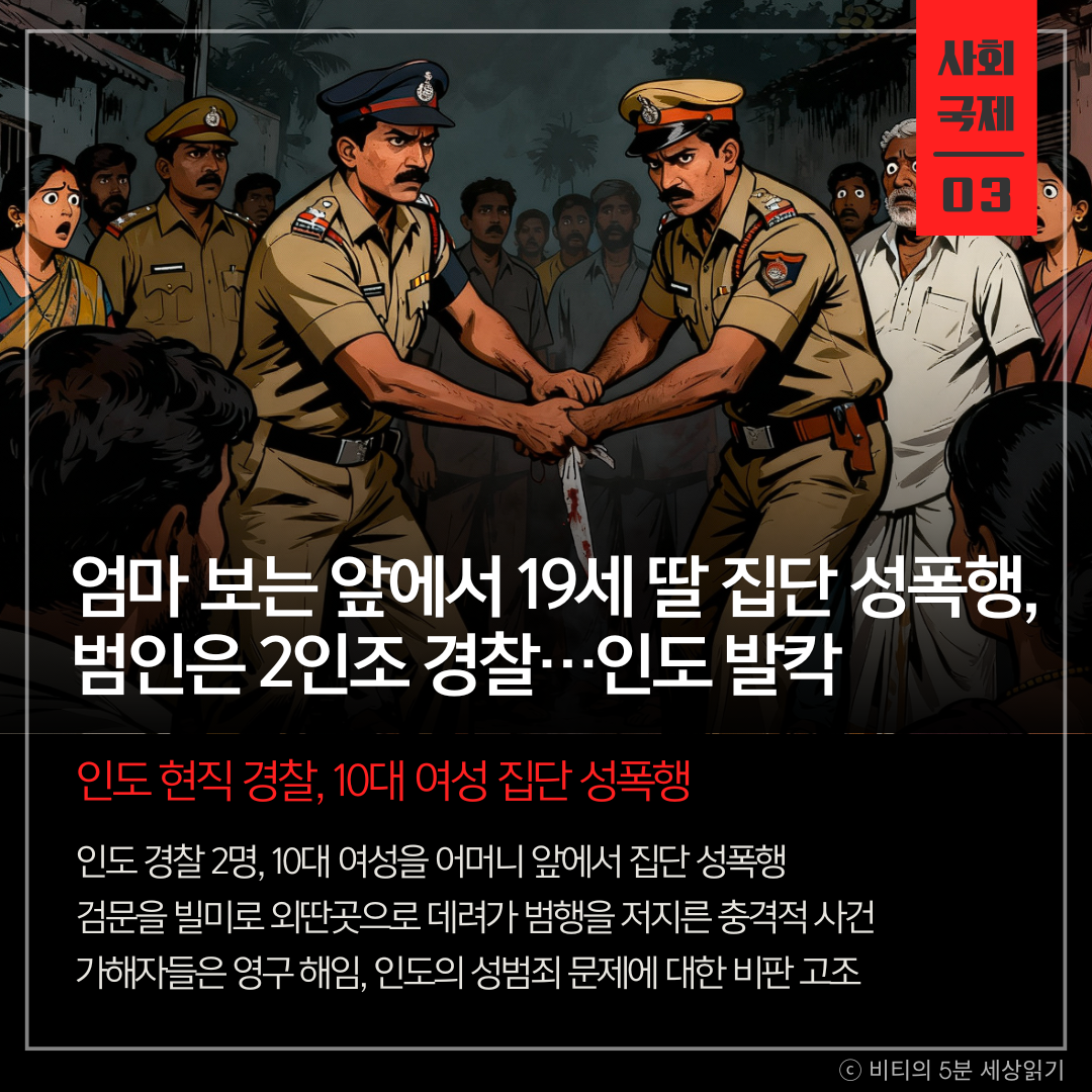 인도에서 현직 경찰관 2명이 검문을 빌미로 10대 여성을 어머니가 보는 앞에서 집단 성폭행하는 사건이 발생했다. 가해 경찰관들은 범행을 인정하고 영구 해임되었으며, 이번 사건은 인도의 고질적인 성범죄 문제를 다시 한번 부각시켰다.