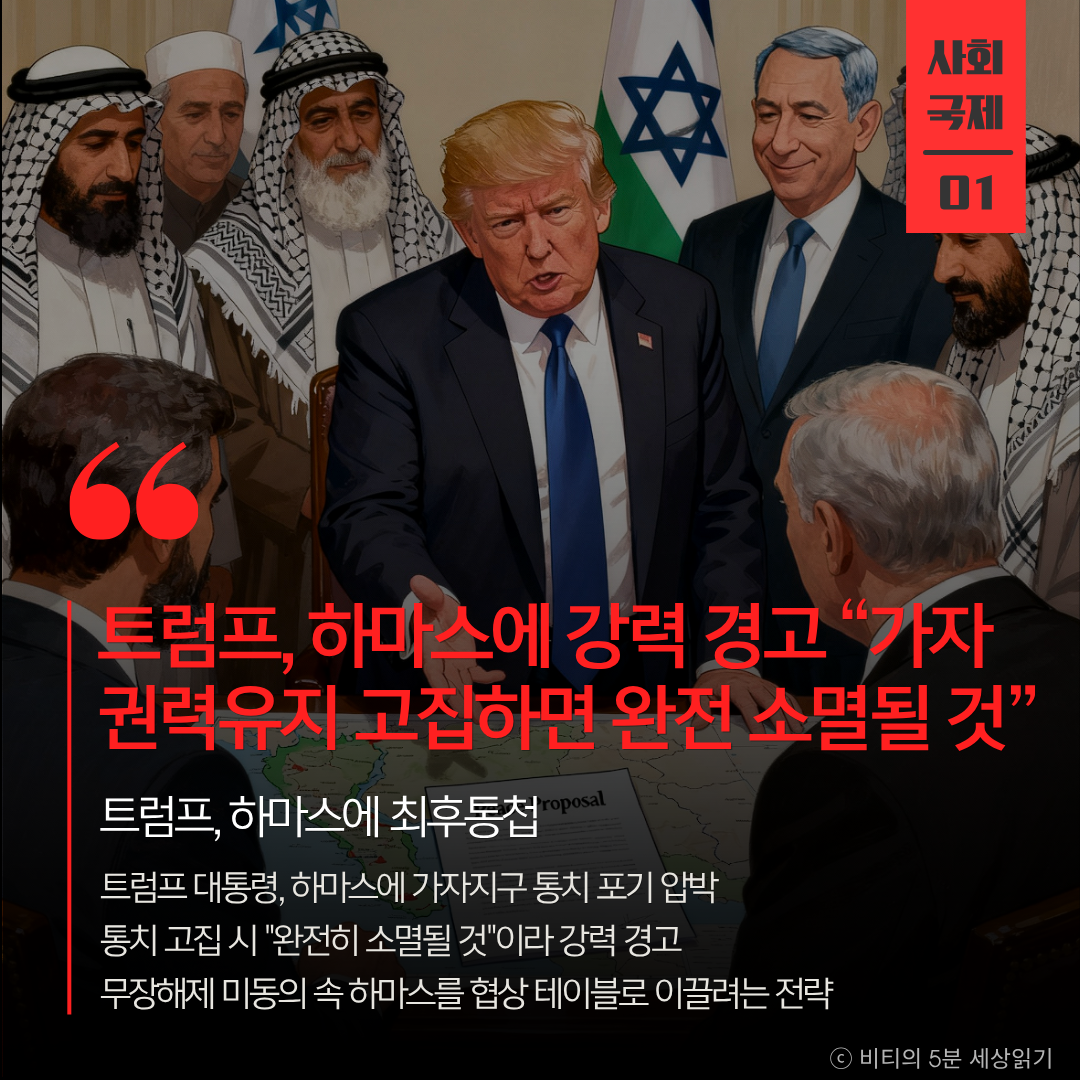 트럼프 대통령이 하마스가 가자지구 통치를 고집할 경우 "완전히 소멸될 것"이라고 강력히 경고했다. 이는 하마스가 트럼프의 평화구상안을 선별적으로 수용한 데 대한 압박으로, 무장해제 등 핵심 사안에 대한 수용을 촉구하는 최후통첩으로 풀이된다.