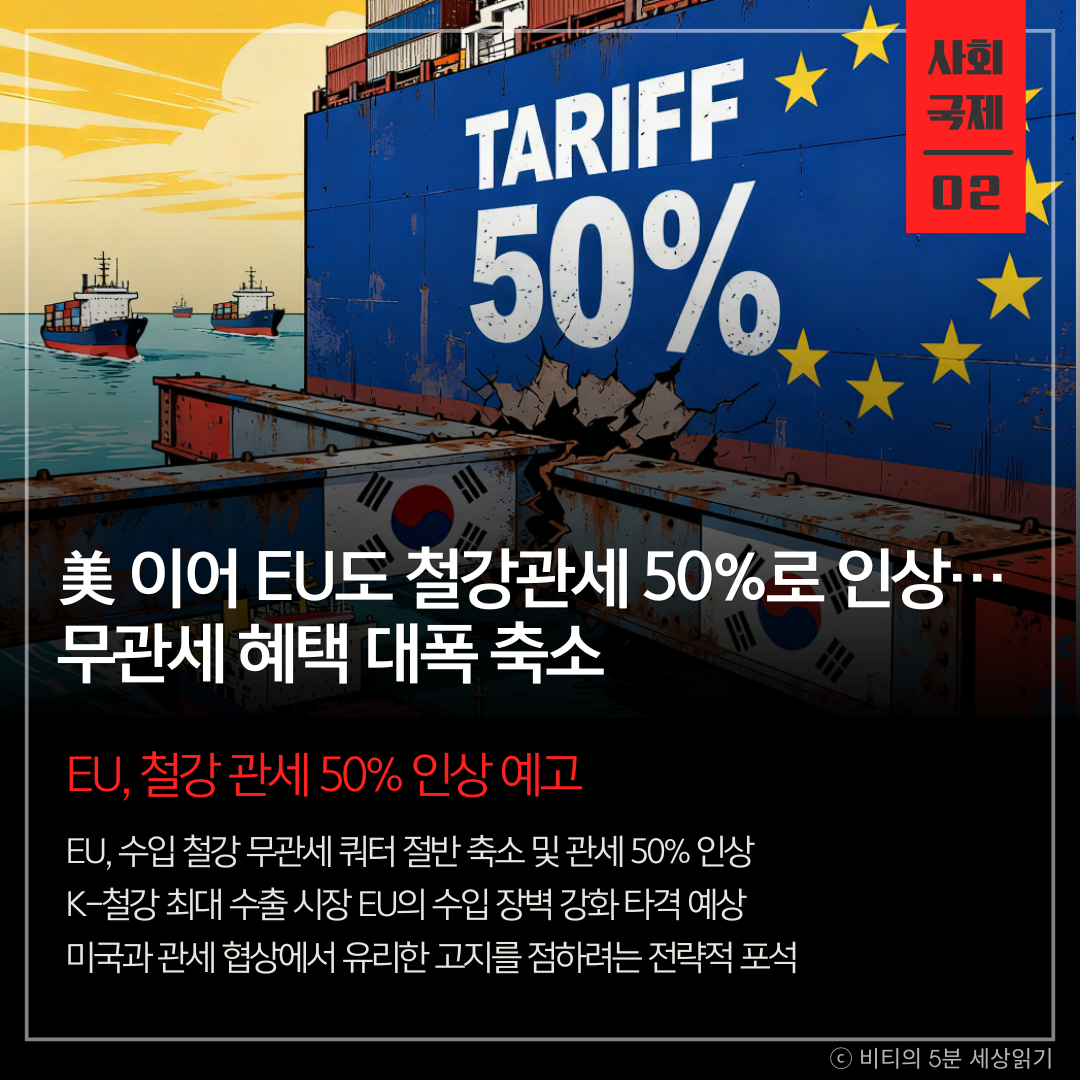 유럽연합(EU)이 역내 산업 보호를 명분으로 수입 철강의 무관세 할당량을 절반으로 줄이고 초과 물량 관세를 50%로 인상한다. K-철강의 최대 수출 시장인 EU의 이번 조치로 국내 철강업계의 타격이 예상된다.