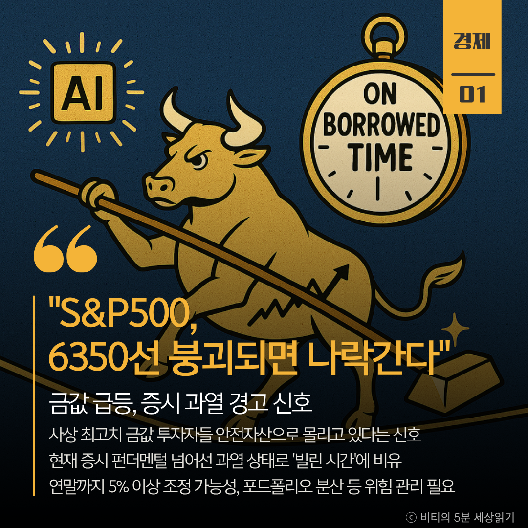 그는 "금이 주식 시장을 극적으로 앞지른다는 것은 주식 시장이 마치 '빌린 시간 속(on borrowed time)'에서 움직이고 있다는 뜻"이라며 현재 증시가 펀더멘털을 넘어선 과열 상태라고 지적했습니다. 지금의 상승장은 금리 인하 기대감과 AI 기술주 열풍 등 낙관적 심리에 의한 것으로 언제든 붕괴가 올 수 있다는 것입니다.