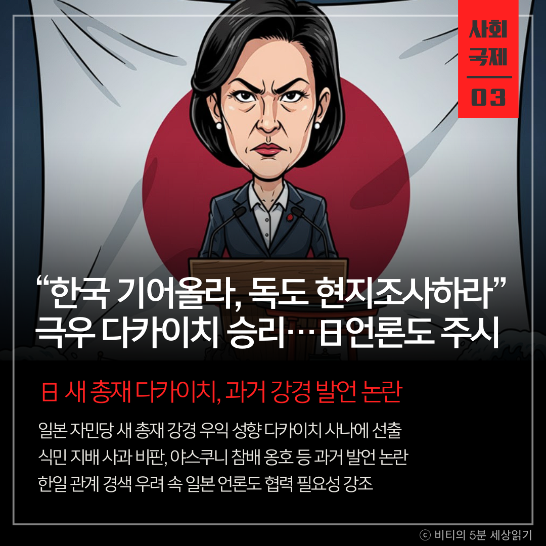 일본이 가장 오른쪽으로 방향을 틀었습니다. 다카이치 총재의 등장은 한미일 3국 공조가 중요해지는 시점에 가장 큰 외교적 변수로 작용할 것입니다. 그의 '입'이 동아시아의 평화를 좌우할 수 있습니다.