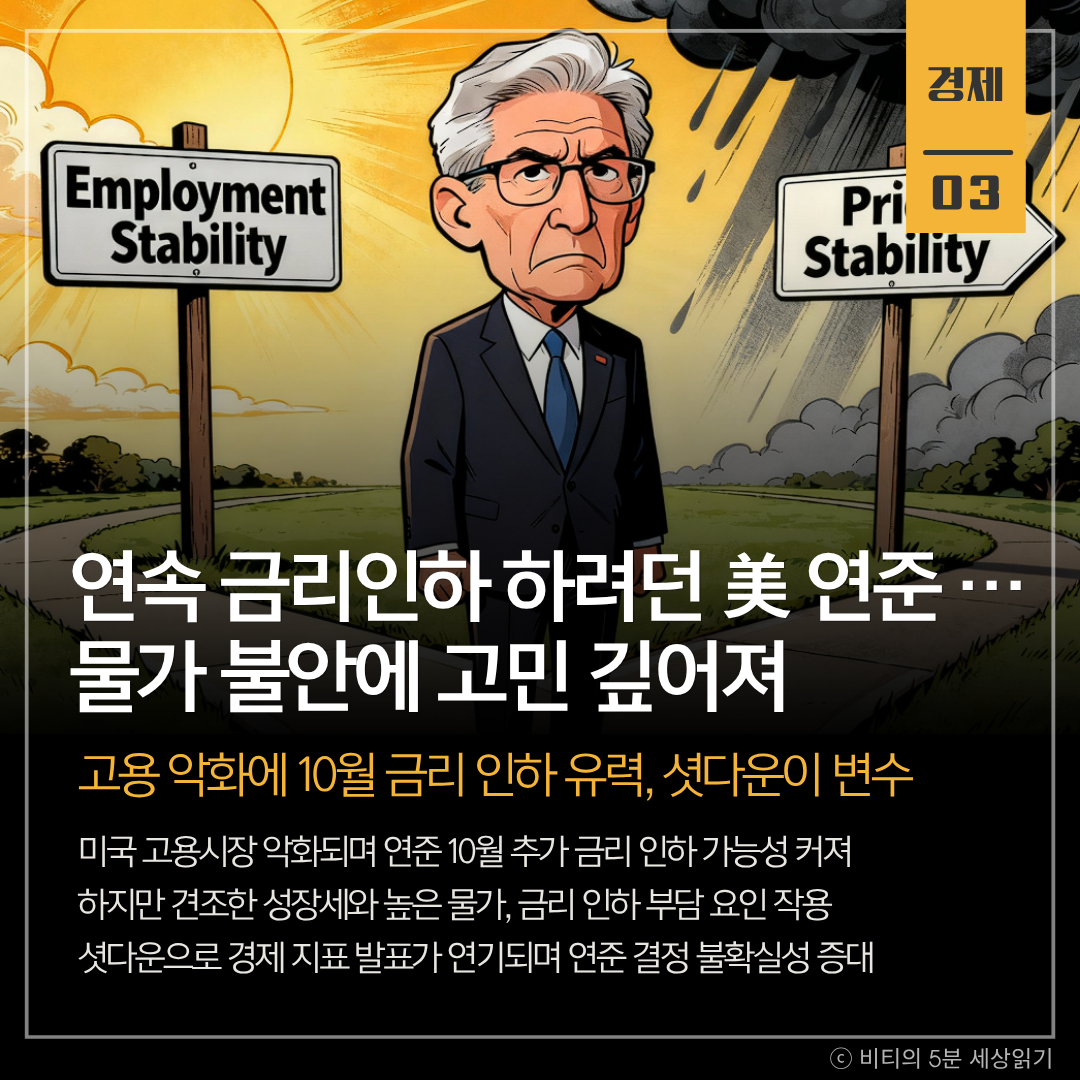 고용 악화를 막기 위한 '금리 인하'와 물가 안정 사이에서 연준의 딜레마가 깊어지고 있습니다. 여기에 셧다운이라는 정치적 변수까지 더해져, 연준의 결정은 그 어느 때보다 복잡한 방정식을 풀어야 하는 상황에 놓였습니다.