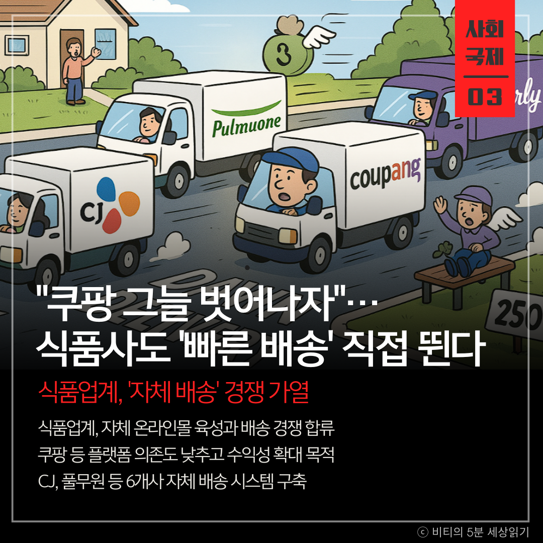 식품업계가 '빠른 배송' 경쟁에 대거 합류하고 있습니다. 최근 새벽 배송 논란에도 불구하고, CJ제일제당, 풀무원 등 주요 식품사들이 자체 온라인몰(자사몰)을 키우고 자체 배송 시스템까지 구축하고 있습니다. 이는 쿠팡, 컬리 등 기존 이커머스 업체들에 대한 물류 의존도와 비용 부담을 낮추기 위한 전략입니다. 국내 20개 식품사 중 15개사가 이미 자사몰이나 자체 물류를 운영 중이며, 이로 인해 물류 경쟁은 더욱 치열해질 전망입니다.
