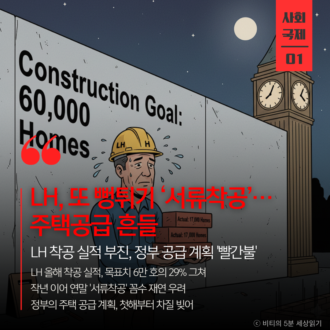 이재명 정부 주택 공급의 핵심축인 LH의 올해 착공 실적이 연 목표치 6만 호의 29%인 1만 7천여 가구에 그쳤다. 이대로라면 작년처럼 연말 '서류착공' 꼼수 없이는 목표 달성이 불가능해 정부의 주택 공급 계획이 첫해부터 흔들리고 있다.